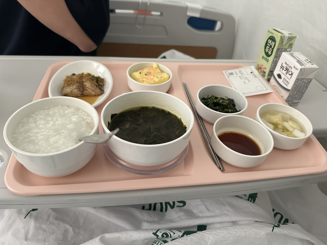 식사는 항상 미음이 나왔고 나는 죽을 좋아하고 간이 센 음식을 좋아하지 않다 보니 병원밥은 아주 맛있게 먹었다. 남편은 내가 남긴 밥양을 체크하고 소변량도 체크했다.(간호사선생님이 체크하라고 함)