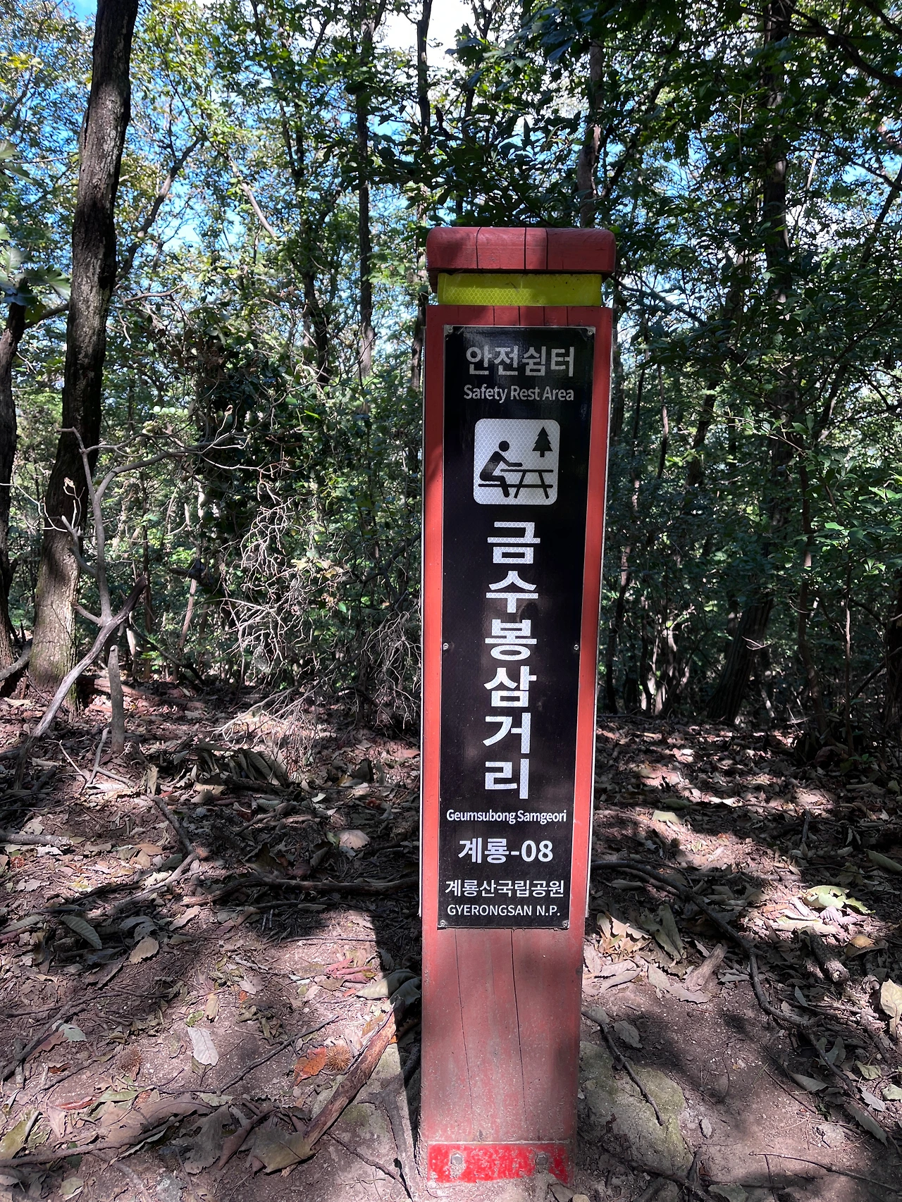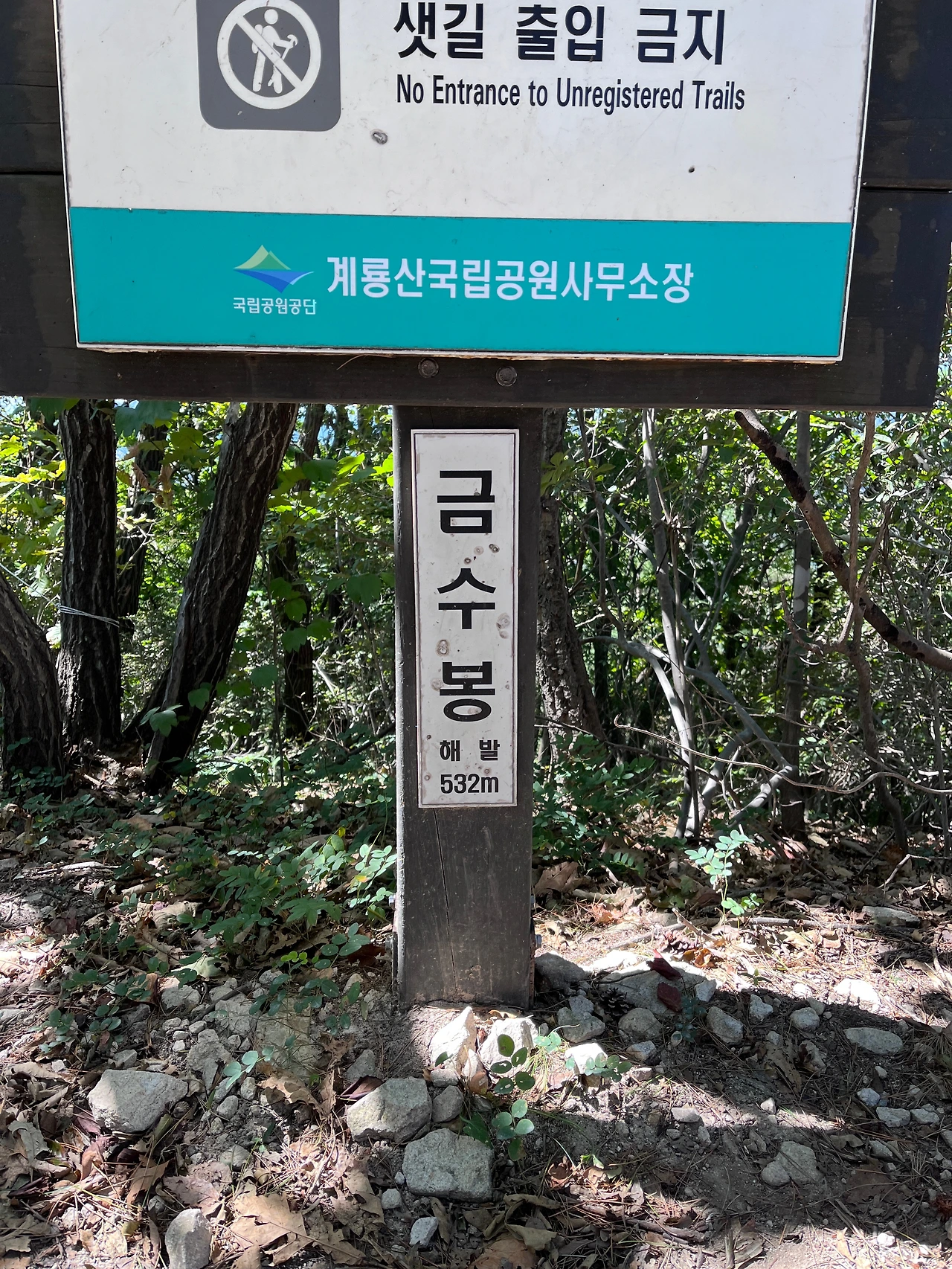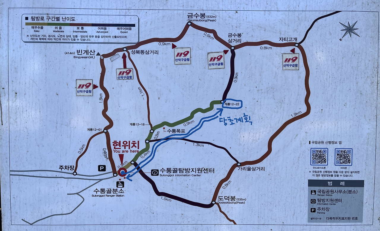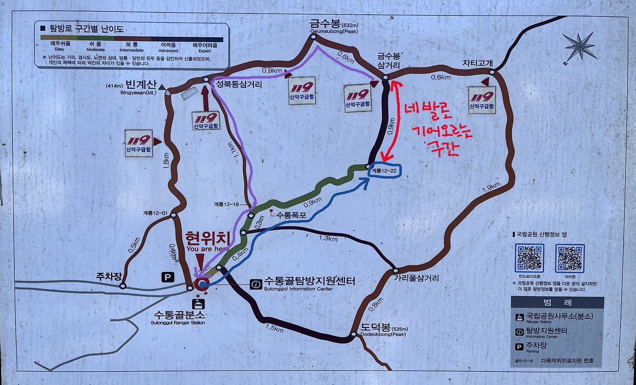 탐방로를 살폈다. '계룡 12-22' 지점에서 '금수봉 삼거리'까지 0.9km 구간의 난이도가 '어려움'이었으나, 그리 길지 않은 구간이니 괜찮겠다 싶었다. 그것은 큰 오산이었다! 0.9km 지옥의 길에 발을 들였다.