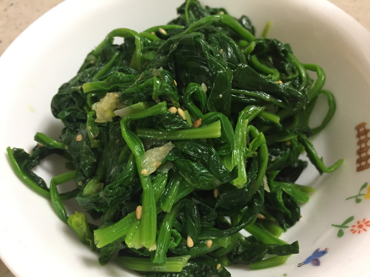 털어놓은 시금치를 작은 볼에 옮겨 담고, 다진 마늘 반 스푼, 소금 조금, 참기름을 뿌리고 시금치들이 너무 망가지지 않도록 손으로 조물조물 무쳐낸다. 깨로 마무리한 후, 시금치 잎 하나를 집어 들어 입에 넣는다. 짭조름한 소금과 알싸한 마늘 향이 고소한 참기름과 함께 입안에서 은은한 춤을 춘다. 숨 죽은 시금치가 나물로 무쳐졌다.