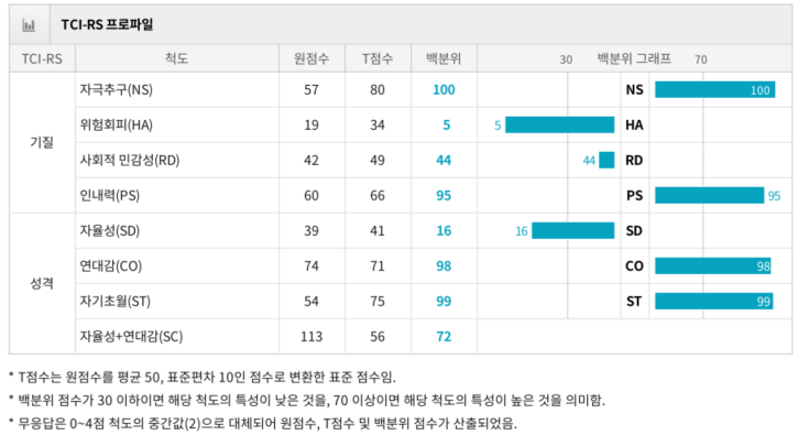 이 모든 게 내가 심리 상담을 받기로 한 계기가 되었다. 그동안 궁금했던 TCI 검사도 함께 진행했다. 전화 상담이었지만, 상담사의 목소리에는 따뜻함이 묻어났다. 검사 결과를 보며 상담사가 말했다.