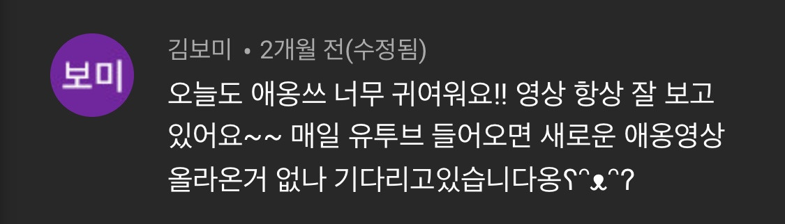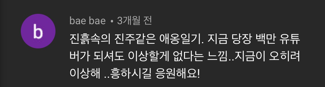 자, 이쯤 되면 누군가는 이렇게 생각할 수도 있다. 그건 너의 영상이 구리기 때문이 아닐까? 라고. 반려동물 채널의 범주 안에서 본다면 비슷한 시기에 알고리즘의 수혜를 입은 다른 채널들에 비해 영상의 퀄리티 만은 뒤지지 않는다고 자신한다. 물론 자극적인 소재와 외줄타기를 통해 조회수 어그로를 끌지 못한 건 인정. 끝끝내 그 짓은 못하겠지만.