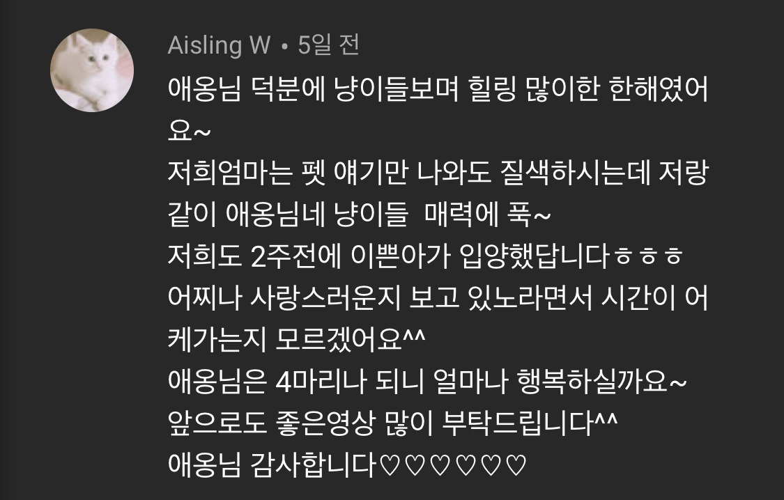 어쨌든 '진심은 통한다'는 지극히 어리석은 마인드로 근근이 채널의 수명을 유지하고 있는 와중에 감사하게도 영상을 좋아해주는 사람이 늘어나고 있다. 영상을 업로드할 때 마다 제일 먼저 달려와 댓글을 남겨주시는 분들, 한 번에 몰아서 정주행 해주시는 분들, 네 마리 고양이의 특성을 이제는 나보다도 더 잘 알고 계시는 분들. 그런 사람들은 내가 끝끝내 이 채널을 포기하지 못하는 가장 큰 이유다.