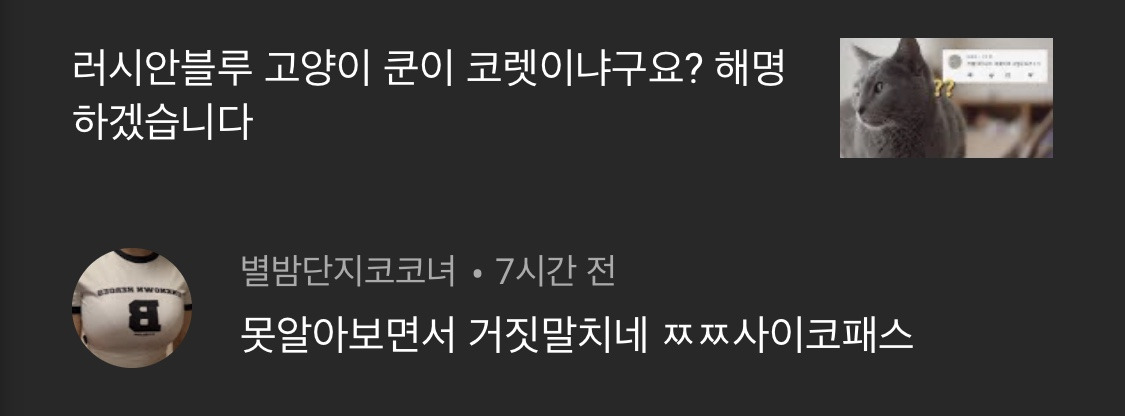 물론 해 드는 곳이 있으면 그늘진 곳이 있고, 칭찬이 있으면 욕도 있는 법이다. 우리 채널에서는 '러시안블루'라는 키워드가 가장 노출이 잘 되는 편이라 유독 쿤이의 영상이 조회수가 많은 편인데 이 녀석이 좀 사납다. 그래도 내 눈에는 귀여우니 영상의 흐름은 항상 '너는 나를 괴롭히지만 그래도 나는 너를 무지막지 사랑해'하는 식이다. 그 아래에는 이런 댓글이 아주 가끔 달린다.