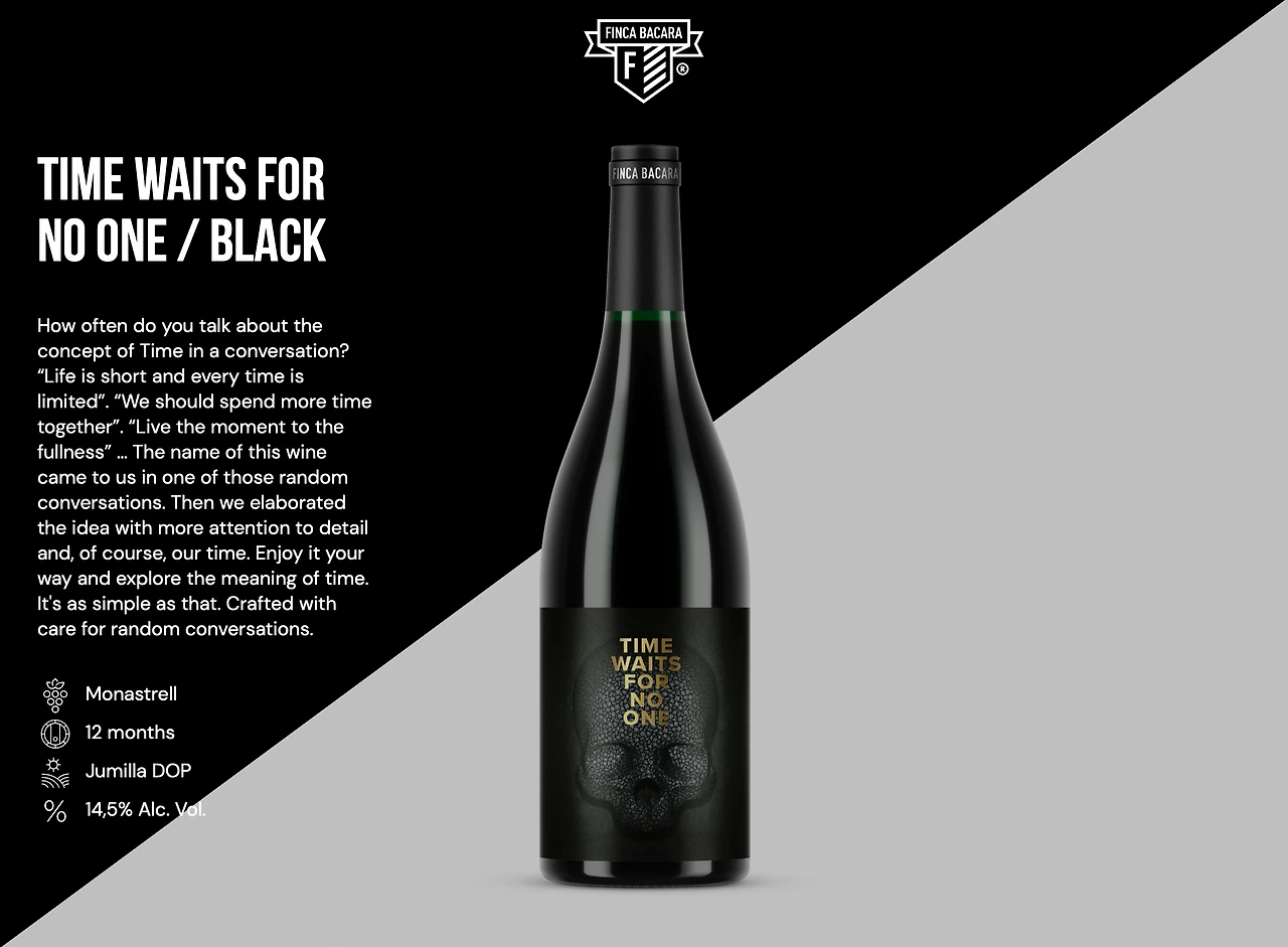 오늘의 와인은 스페인 후미야 지역의 핀카 바카라(Finca Bacara) Time Waits for No One (Black Label) 2018이다. 시간은 그 누구도 기다려주지 않는다니… 어쩜 이렇게 오늘의 대화 주제와도 잘 맞을까 싶지만 딱히 대화 주제에 맞는 와인을 골랐다기보다는 이 와이너리의 모나스트렐 품종의 와인을 마셔보고 싶었다.