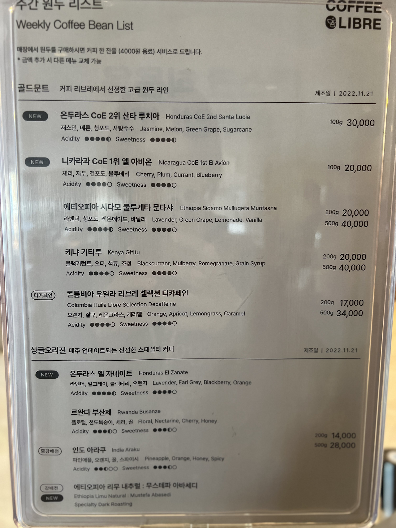 항상 그렇듯 우리는 카페 리브레로 향했다. 평소라면 진열대의 원두들을 보면서 뭘 마실까 고민을 하는데 그날은 남편이 별다른 망설임도 없이 주문을 한다.