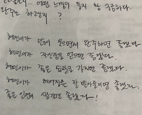 이렇게 평범하게 걷다 보면 내가 얻고자 하는 이 무거운 질문의 대답을 가지고 돌아갈 수 있을지 의문이 들었다. 나는 특별한 사람이 아니어서 이 평범함에 끔찍이 묻혀버려 빈손으로 돌아가면 어떡하나 탄식도 하면서 말이다. 생각을 환기시키려 나갔다가 더욱이 복잡한 감정을 가져온 내가 미련해지긴 했지만 숙소에 돌아와 까미노의 첫 날을 기록했다. 그리고 이 일상 같은 걸음 속에서 내가 꼭 가져가고 싶은 것들, 그렇게 산티아고에서 바뀌어있을 나의 모습들을 적어갔다. 그 목록은 아래와 같다.
