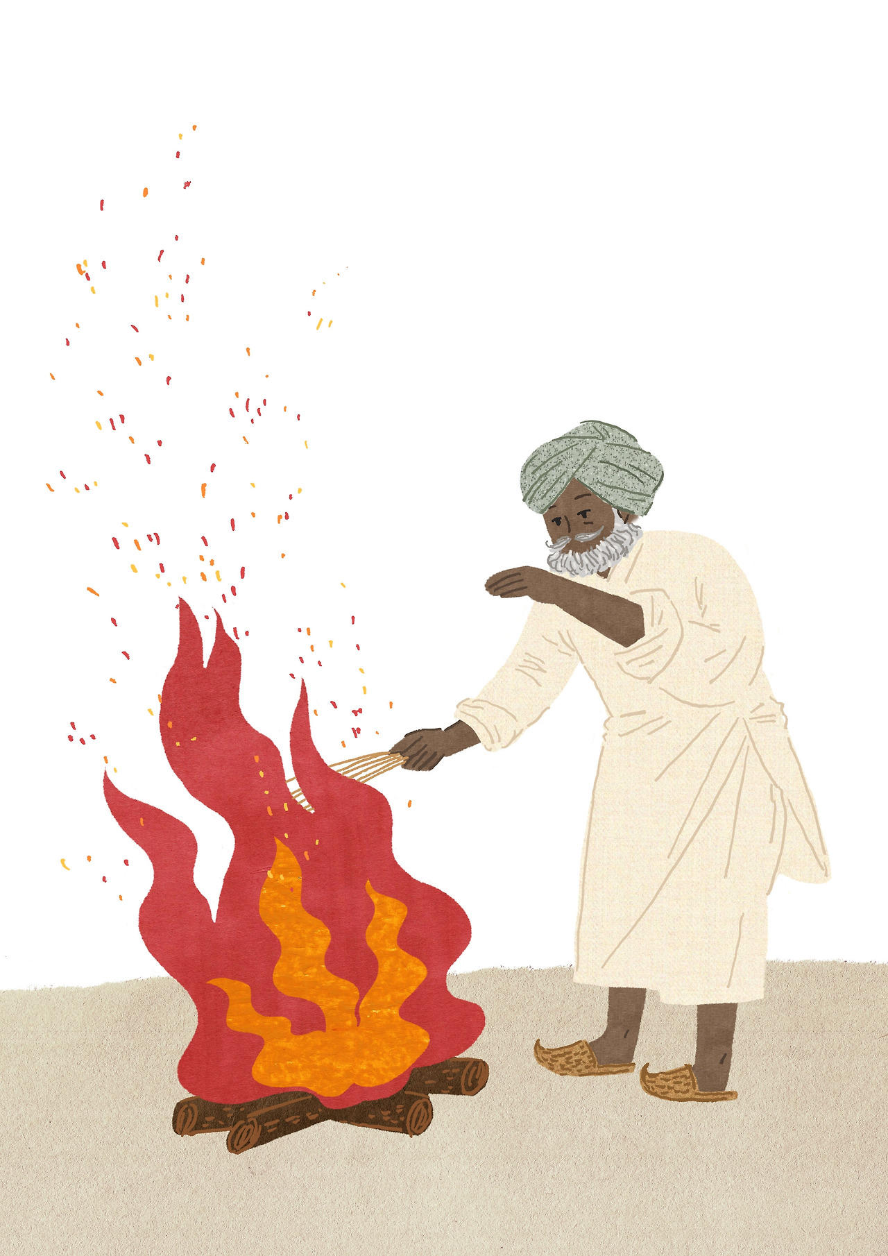 인도 타임으로 다음 버스를 기다리기엔 시간이 너무 지체될 게 뻔했다. 이미 인도의 만원 버스를 여러 번 겪었으므로 고민 없이 버스에 오르기로 했다. 버스 기사 옆자리에 짐짝처럼 구겨져 머리도 들지 못하고 공벌레처럼 말려있어야 했지만. 창으로 들어오는 뜨거운 햇빛이 공처럼 말린 내 뒷목을 뜨뜻하게 지져댔다. 얼마큼의 시간이 지나가는지도 모르게 한 자세로 끼여가다가 쿠리! 쿠리! 외치는 소리에 던져지는 짐짝처럼 버스에서 내동댕이 쳐졌다. 바삭하게 마른미역이 된 기분이었다. 숙소를 알아볼 기력도 없이 제일 먼저 보이는 숙소 타이타닉으로 들어가 아무 의자에 몸을 부렸다. 그동안의 여독이 쌓인 건지 장시간 햇빛을 쬐여서인지 오래 사용하지 않은 녹슨 수도꼭지를 튼 것처럼 간격을 두고 터지듯이 코피가 쏟아져 나왔다. 그리고 자이살메르에 있는 아픈 일행과 같은 증상으로 앓아누웠다. 메스꺼움을 동반한 어지럼증과 고열. 어제 아픈 일행과 같이 자이살메르의 밤이 너무 좋다며, 침낭을 들고 숙소 루프탑에서 잔다고 누웠다가 모기에 잔뜩 뜯긴 터였다. 그중 말라리아모기가 있었을 수도 있다는 생각이 번뜩 스쳤다. 짐도 못 풀고, 짚으로 된 지붕에 붉은 흙으로 지어진 숙소에 들어가 이건 말라리아가 분명하다고 씩씩거리며 한참을 앓다가 자다가를 반복하였다. 내 목 뒤를 뜨겁게 지져대던 붉디붉은 해가 저물수록 식은땀도 좀 잦아들더니 몸이 많이 괜찮아졌다. 이불을 둘둘 말고 방 밖으로 나왔다. 어느새 별은 총총이 떠있고 타닥타닥 타는 모닥불 주위로 사람들이 둘러앉아 도란도란 수다를 떨고 있다. 짜이를 하나 받아 들고, 나도 모닥불 앞에 앉았다.
