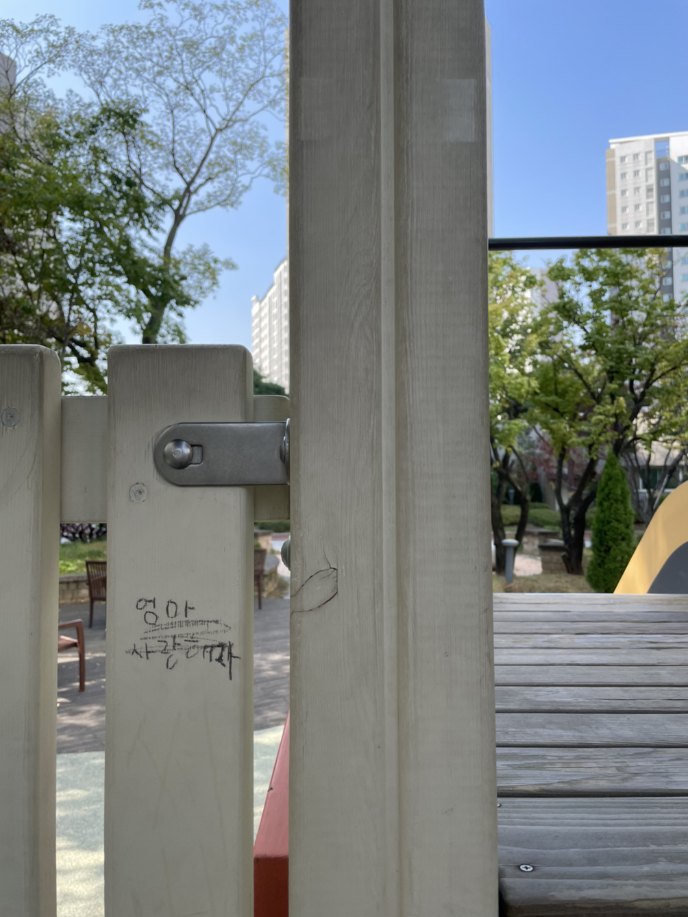 집 앞 놀이터에서 낙서를 발견하는 재미도 있었다. 입에 담기 힘든 그런 낙서가 아니고, 귀엽고 귀여운 낙서들을 발견하면 이 동네 꼬마들에 대한 애정이 한 뼘 더 자라났다.