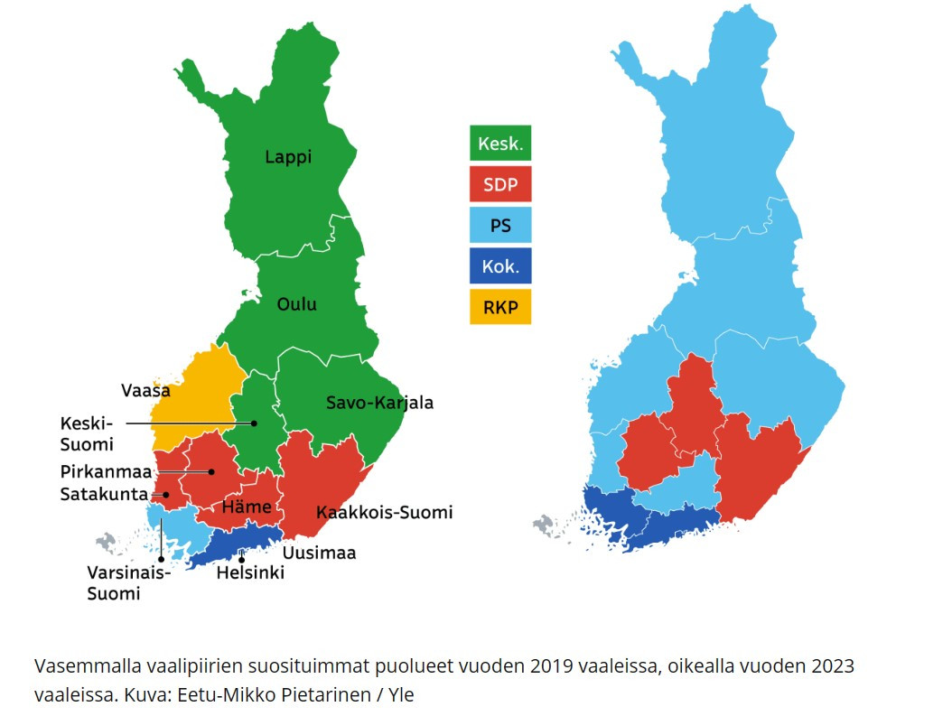 표에 보다시피 2019년 당시 지역별로 가장 많은 의석수를 차지한 정당과 2023년 현재의 상황을 보라. 2019년에는 핀란드 중북부 지역이 모두 녹색(중앙당)이었다. 그런데, 그 지역이 2023년에는 모두 하늘색(핀인당)으로 바뀌어있다. 중앙당의 참패는 정치의 극단적인 양극화의 상징이요, 녹색당의 참패는 기후위기정책이 팍팍한 민생경제에 밀려났다는 뜻이리라. 또한 좌파동맹의 참패는 나토 가입을 대놓고 반대한 것에 대한 안보불안심리의 응징이리라.