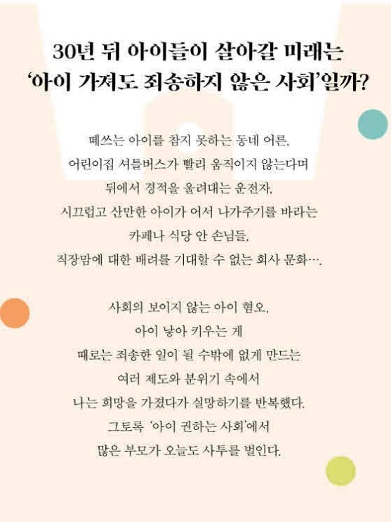2016년 1월, 첫아이가 태어난 지 두 달째가 되던 무렵 지금의 직장에 경력직으로 입사했습니다. 맞벌이, 베이비시터와의 만남과 헤어짐, 남편의 퇴사, 다시 육아휴직. 일을 그만둘 수도, 계속할 수도 없는 지속되는 힘든 과정 속에 출퇴근길 틈틈이 모아 온 브런치 글이 사회적 메시지를 담은 육아 에세이 <아이 가져서 죄송합니다>로 오늘 출간됐습니다.