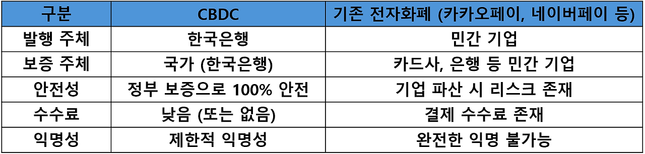 현재 우리가 사용하는 카드나 모바일 페이는 대부분 민간 기업(카카오페이, 삼성페이, 네이버페이 등)이 운영하는 시스템이에요. 결제는 사용자의 카드나 계좌에서 간접적으로 처리되고, 기업이 보증하는 방식이죠. 하지만 CBDC는 한국은행이 직접 발행하고, 국가가 보증하는 안전한 결제 수단입니다.