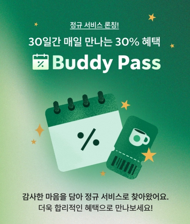 스타벅스 버디패스는 스타벅스 코리아가 개점 25주년을 기념하며 출시한 구독형 서비스인데요. 스타벅스를 자주 이용하는 회원에게 다양한 혜택을 제공해 스타벅스 이용 빈도를 높이는 것이 목표입니다. 월 7,900원의 구독료로 다양한 할인을 받을 수 있어요.
