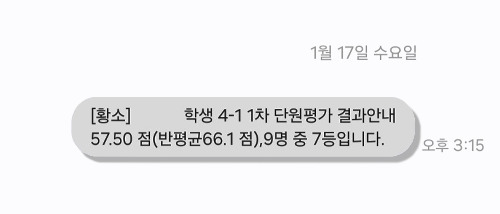쪼꼬미는 단원평가 후 5일 동안 매일같이 점수를 궁금해했다. 한 주 후 아이가 수업에 들어가자마자 학원에서 문자가 왔다. 57.5점, 9명 중 7등.