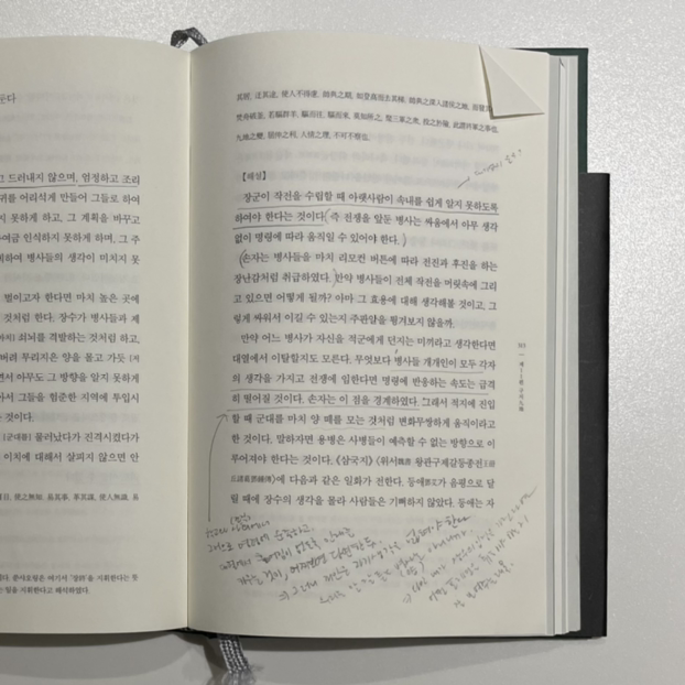 결국 전쟁에서 이기기 위해서는 장수가 병법의 원칙을 이해하고 객관적인 여건을 갖추어 "패배할 수 없는 땅"에서 이길 싸움만 한다는 것이 요이다. 나는 '전쟁'의 자리에 '사업' 같은 인생과 관련된 어떤 주제도 올 수 있다고 생각하며 읽었더니 절로 몰입이 되었다.