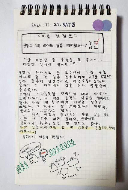황천락이 주는 메시지는 매일 사소한 기록으로도 행복을 찾아갈 수 있음을 전해주려던 것이 아니었을까? 황천락은 자신의 일기장 표지에 “황천락의 즐거운 일기”라고 써놨다. 그 일기에는 인생 최고 점수받았던 날, 돈 모아서 앨범 산 날... 등 소소하지만 행복한 기록들이 무수히 담겨 있었다. 그 장면을 보면서 문득 내 일기장이 떠올랐다. 내 일기에는 주로 '상처받았던 날, 다시는 실수하지 않겠다는 미래의 다짐' 등으로 가득 차 있었다. 나는 그동안 마음의 안식처가 필요하거나, 내 속마음을 털어놓을 때만 일기를 찾았다. 그렇게 쌓인 내 기록들엔 즐거움을 찾기란 쉽지 않았다.