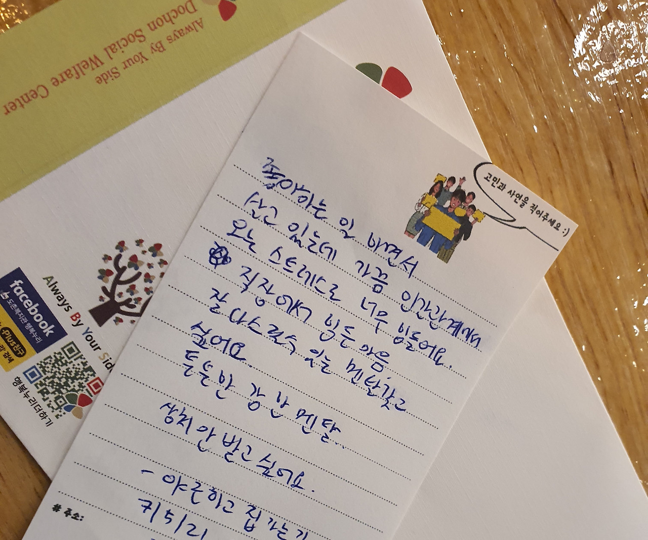 어느 날, 외근을 하고 밤늦게 집으로 돌아가는 길이었다. 지하철을 타고 집 근처 역에 내렸는데, 광장에 달아놓은 조명들이 유난히 반짝거려 나도 모르게 이끌려 가까이 가봤다. 함께 우편함이 세워져 있었고, 고민을 적으면 답변을 보내준다는 글에 나는 바로 편지를 썼다.