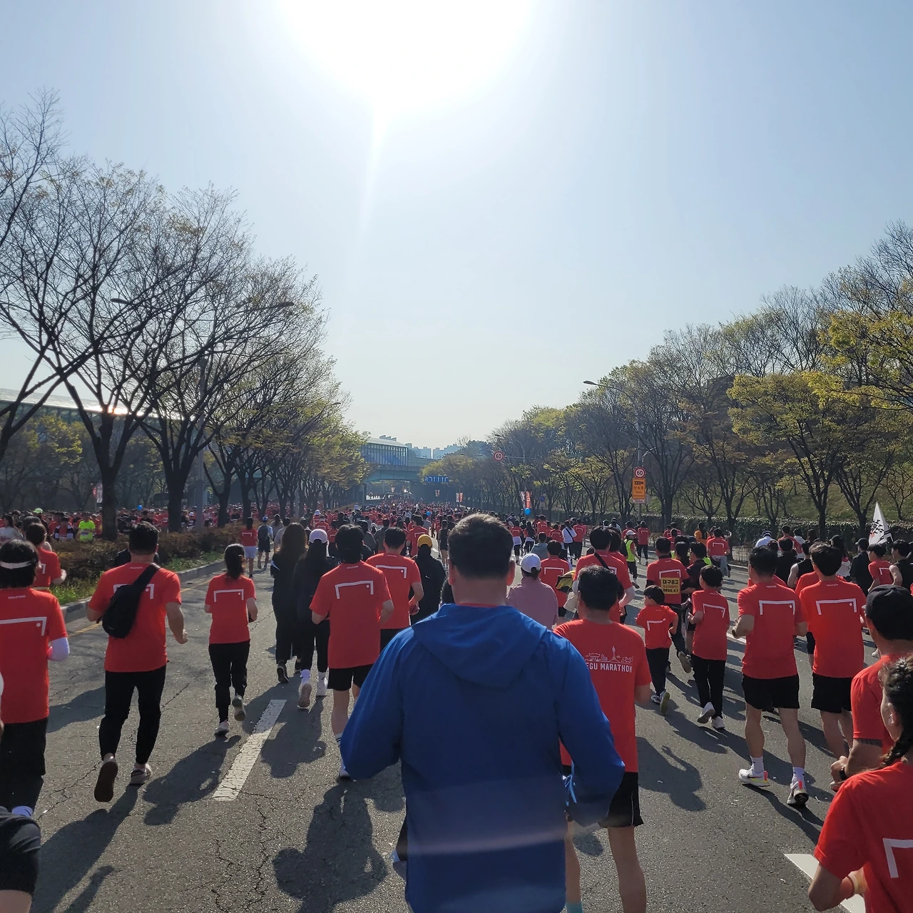 대구스타디움이 너무 넓은 데다 스텝들도 안내가 서툴러서 엄마와 나는 물품 보관소 찾으랴, 엄마 친구분 찾으랴, 화장실 찾으랴 바빴다. 마라톤은 풀코스(42.195km), 하프코스(21.095km), 10km, 5km 순으로 출발하였는데, 엄마와 나는 달리는 지점도 늦게 찾아서 이미 10km 주자들이 출발하는 중이었다. 엄마는 거의 후미에서 출발했다. 나중에 얘길 들어보니 엄마는 항상 선두에서 출발했었고 늦게 출발한 건 이번이 처음이라고 하셨다.그래서 이전 기록보다 조금 늦게 나왔다.
