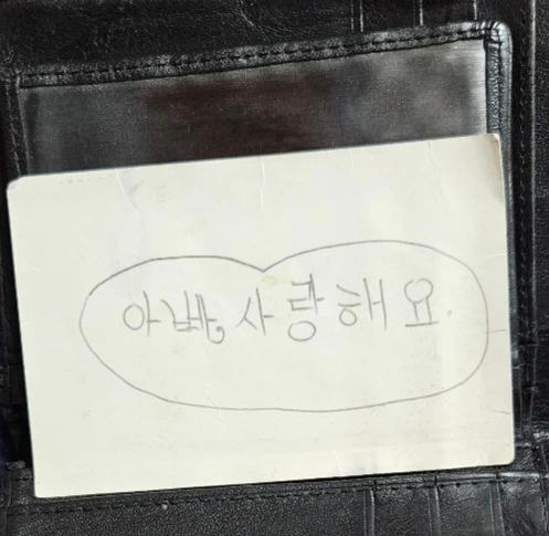 대학교 때 우연히 아버지 지갑에서 내가 초등학교 때 쓴 걸로 추정되는 '아빠 사랑해요'라고 적힌 메모지를 보았다. 내가 이런 걸 적었던 게 전혀 기억이 안 나서 신기하고, 아버지께서 이걸 아직까지 가지고 계신 게 신기해서 사진을 찍어 두었다.