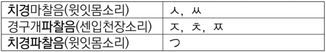 어쨌든 つ발음에 대해 알아보니 조음위치, 조음방법에 따라 치경파찰음(齒莖破擦音)에 속했다. 한국어의 ㅅ, ㅆ는 치경마찰음(齒莖摩擦音), ㅈ, ㅊ, ㅉ는 경구개파찰음(硬口蓋破擦音)이다. 치경음(齒莖音)은 윗잇몸소리, 경구개음(硬口蓋音)은 센입천장소리, 파열음(破裂音)은 공기를 막았다가 터트리는 소리, 마찰음(摩擦音)은 공기가 구강의 어느 한 부분을 통과하면서 마찰을 일으켜 나는 소리, 파찰음(破擦音)은 파열음과 마찰음 둘 다 나는 소리이다. 표로 정리해 보았다.
