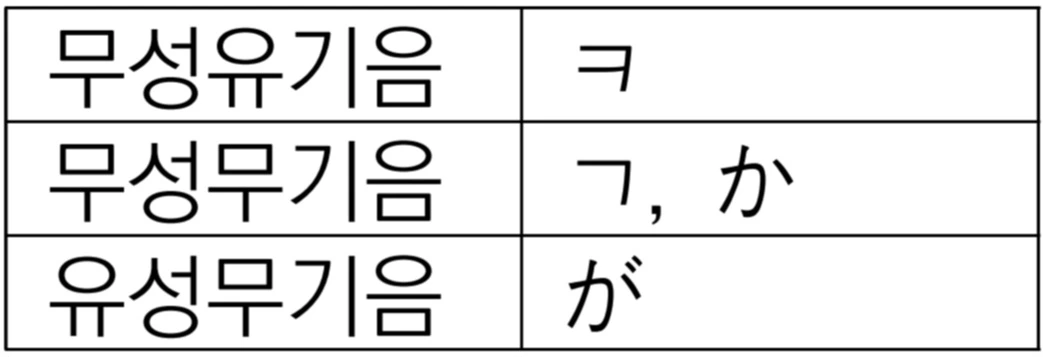 한국어의 ㅋ은 무성유기음, ㄱ은 무성무기음, 일본어의 か는 무성무기음, が는 유성무기음이었다. 표로 정리해 보았다.