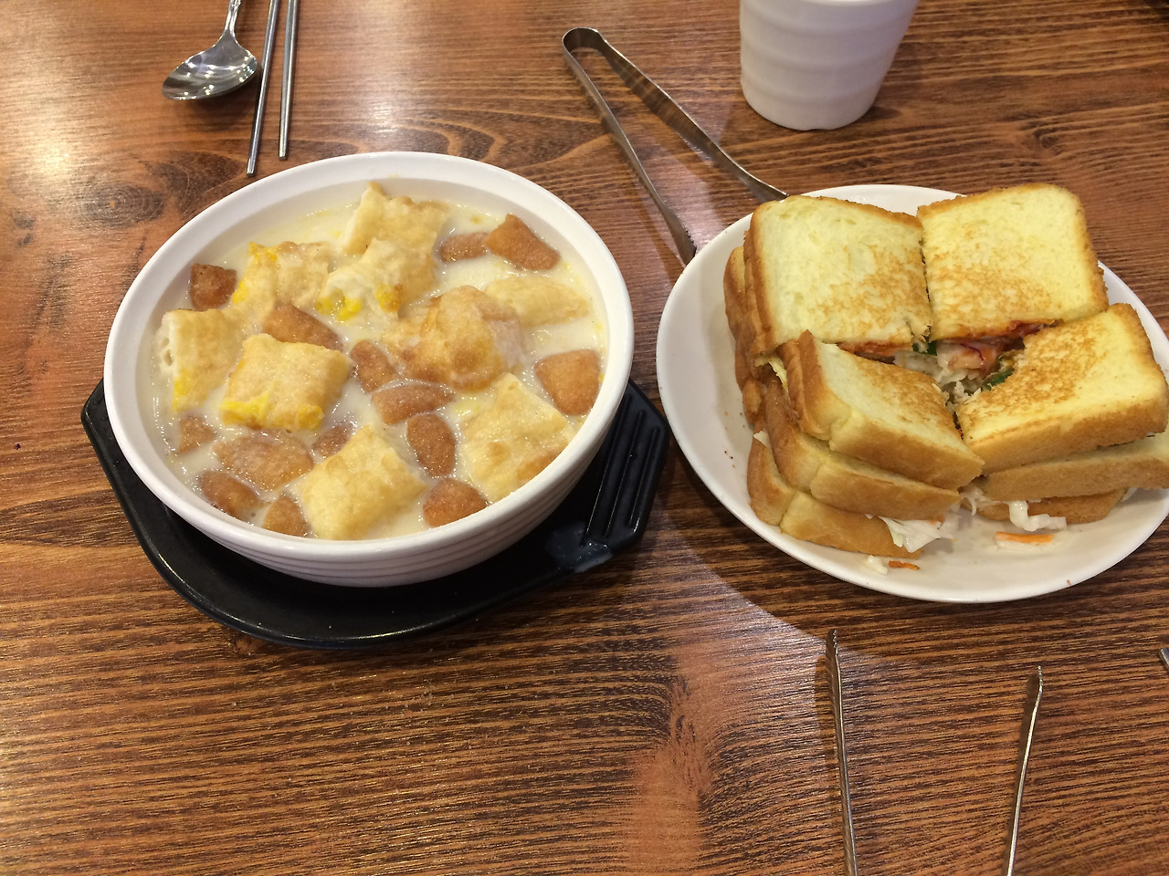 콩국집 메뉴는 콩국이랑 토스트 두개였다. 콩국집에서 파는 토스트는 계란부침이랑 얇은 햄, 다진 양배추에 케첩, 마요네즈를 버무린 것이 들어가 있는데 콩국이랑 꿀조합(꿀組合)이다. 토스트를 시키면 아주머니께서 4등분으로 잘라서 주시기 때문에 부모님이랑 가면 콩국 세 그릇에 토스트 하나 시켜서 먹었다.