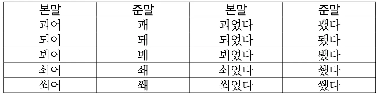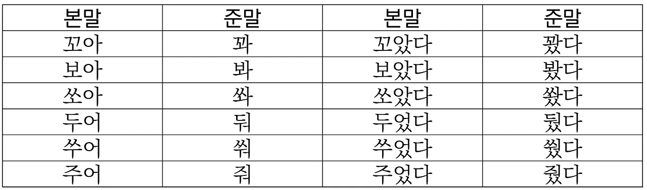 이를 보고 알 수 있는 것은 모음으로 시작하는 어미가 붙을 때 줄여 쓸 수 있다는 것이다. 모음으로 시작하는 어미들의 예시는 다음과 같다.