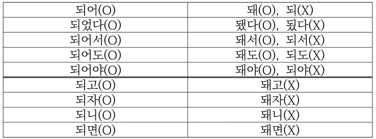 따라서 자음으로 시작하는 어미가 붙을 때는 '돼'가 될 수 없다. 예를 들어 '되다'의 어간 '되'에 청유형 종결어미 '-자'가 붙을 때는 '되자'가 된다. '-어자'라는 어미는 없기 때문이다. 헷갈린다면 국어사전에 붙임표(-)를 꼭 붙여서 '-자'와 '-어자' 둘 다 검색해 보면 된다. 어미, 조사, 접사가 무수히 많고 이를 다 구분하기 쉽지 않기 때문에 어미 '-어, -었-, -어서, -어도, -어야' 만 알아도 '되, 돼'를 어느 정도 구분할 수 있다.