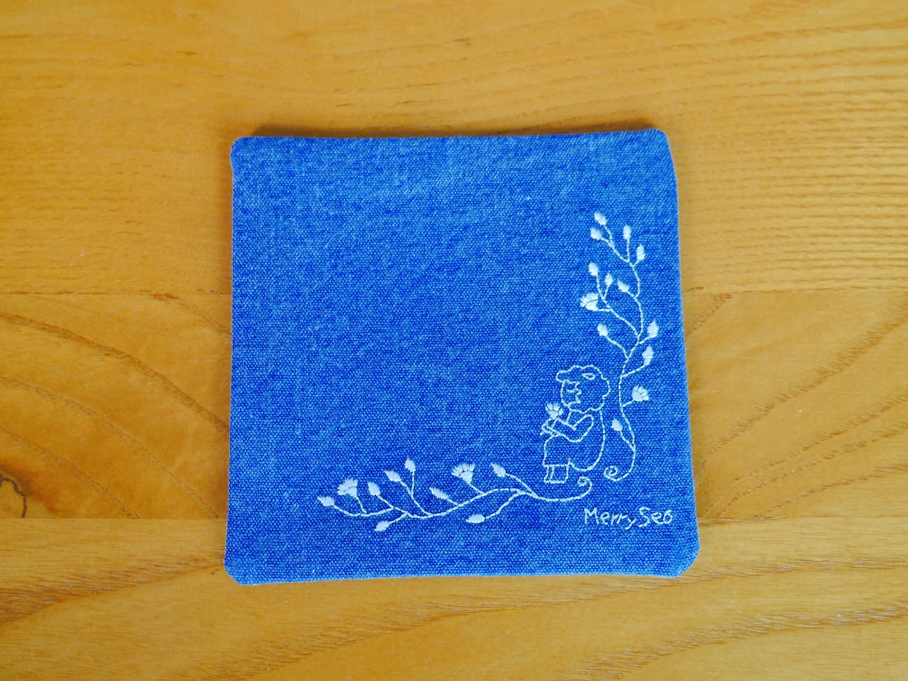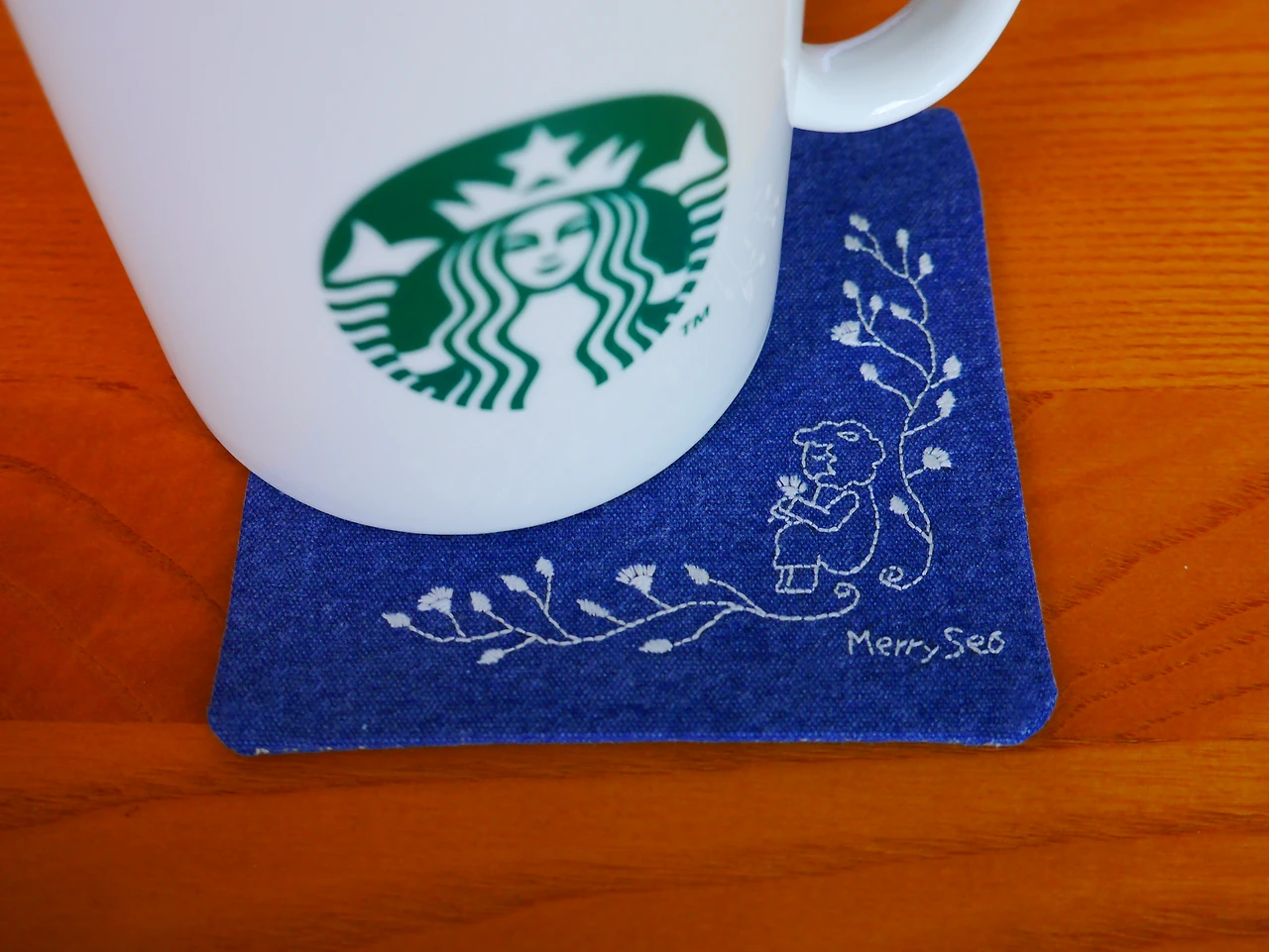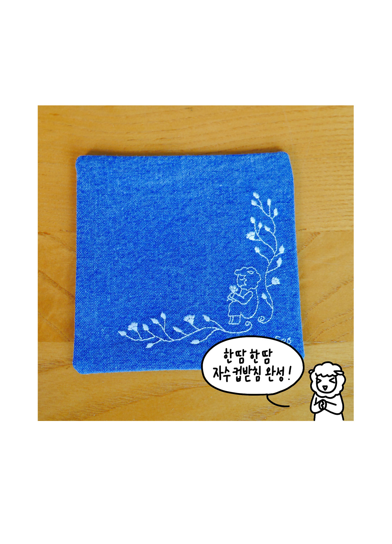 제가 사진을 잘 못찍어서 너무 밝게 나왔는데;; 실제로는 저런 형광 파란색이 아니라 톤 다운된 차분한 파란색 코스터예요 ㅠㅠ 푸른색과 흰색이 조화된 백자 도자기같은 느낌으로 만들고 싶어서 고른 천과 실이거든요...