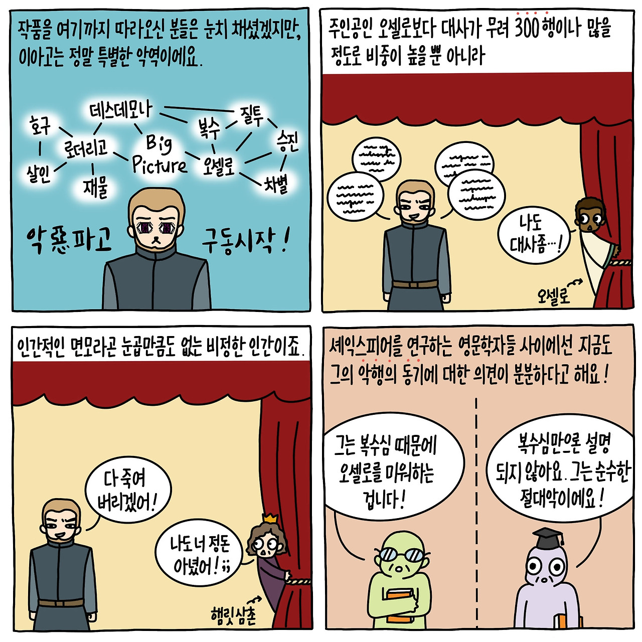 그는 사색이 된 오셀로의 얼굴을 보며 못 이기는 척 한 가지 제안을 덧붙인다. “그래도 물증도 없이 의심을 할 수는 없으니… 괜찮으시다면 제가 캐시오의 마음을 한 번 떠봐 드릴까요?” 오셀로는 눈앞에 있는 자가 어떤 인간인지도 모른 채 미끼를 덥석 문다.