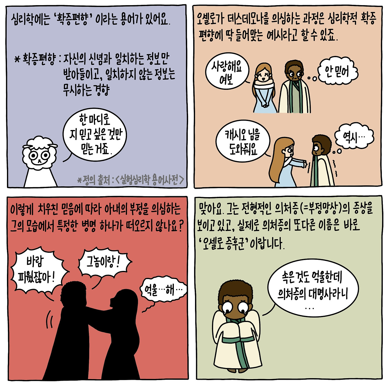 만약 이 자가 처음부터 불륜 운운하며 극단적인 억측을 꺼냈다면 이성적인 오셀로는 결코 흔들리지 않았을 것이다. 어쩌면 제대로 된 증거도 없이 정숙한 아내를 모욕한 벌로 당장 그를 내쳤을지도 모른다. 하지만 이아고는 그렇게 아마추어 같은 접근법을 사용하지 않는다. 그는 간사한 악마의 얼굴 대신 순진한 천사의 얼굴을 하고 들릴 듯 말 듯한 목소리로 혼잣말과 말끝 흐리기 신공을 선보인다. “세상에, 저건 캐시오 님이잖아? 설마 데스데모나 님과? 어쩐지… 아, 아니야. 이건 심증일 뿐이니까. 선량한 두 분의 정절을 의심해선 안 돼. 하지만 그때 내가 보고 들은 건…”