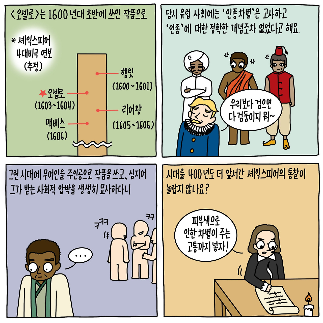 외로운 것은 작품뿐만이 아니다. <오셀로>의 주인공인 오셀로 장군은 4대 비극의 주인공들 가운데서도 압도적으로 고립된 인물이다. 그는 베네치아의 백인 귀족 사회에 끼어 살아가는 유일한 무어인, 다시 말해 흑인이다. 뛰어난 능력과 인품으로 온갖 산전수전을 겪으며 장군의 자리에까지 올랐지만, 아무리 발버둥 쳐도 결코 주류 집단에는 낄 수 없다. 사람들은 그를 이름으로 부르지 않는다. 그는 ‘검둥이’이자 ‘입술 두꺼운 놈’이고, 기껏해야 ‘용맹한 무어인 장군’으로 치켜세워질 뿐이다.