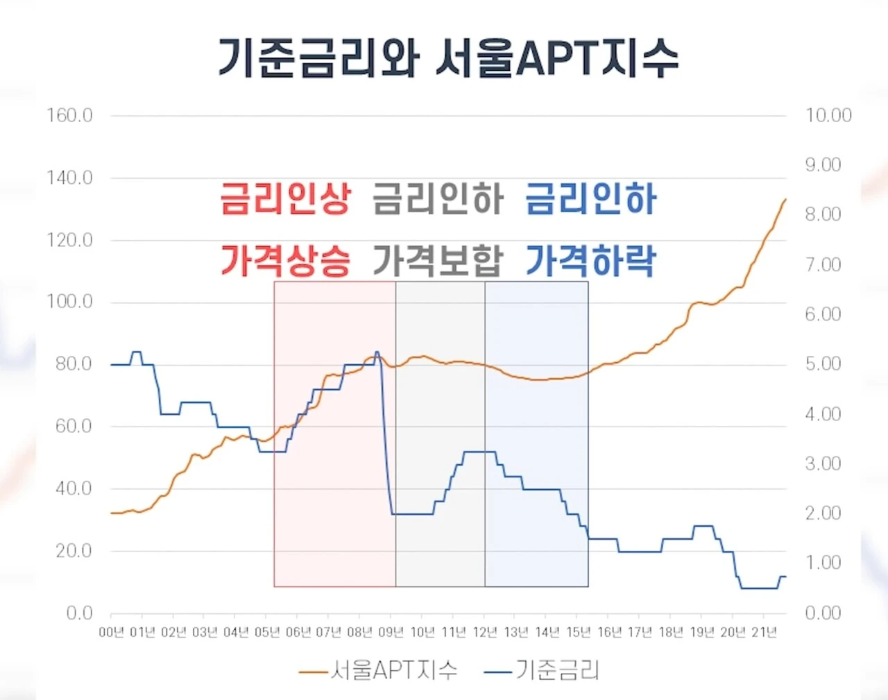 아파트를 거래하려면 대출을 일으켜서 구매해야 하는데 고금리로 인한 대출 부담이 가중되면 부동산을 구입하는 것이 망설여지게 돼서 결국 집값은 떨어진다는 논리이다. 하지만 이것이 꼭 맞지는 않다.