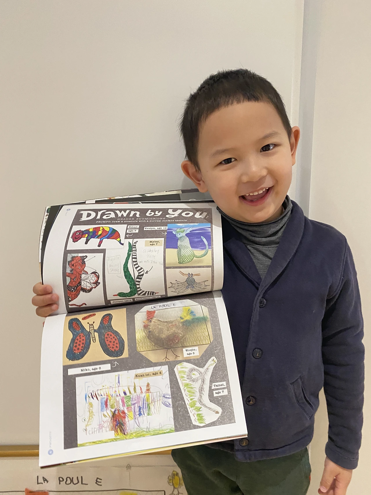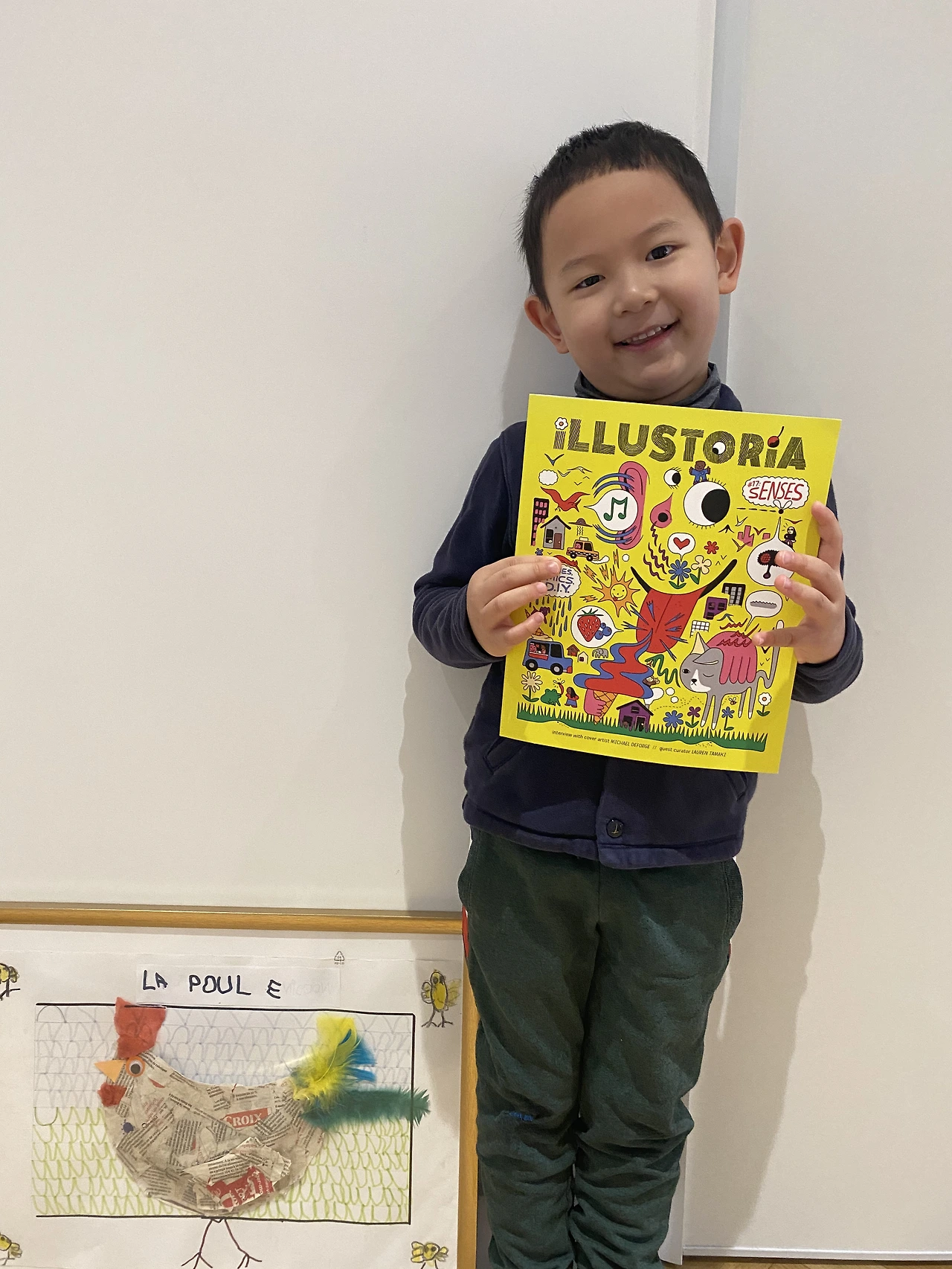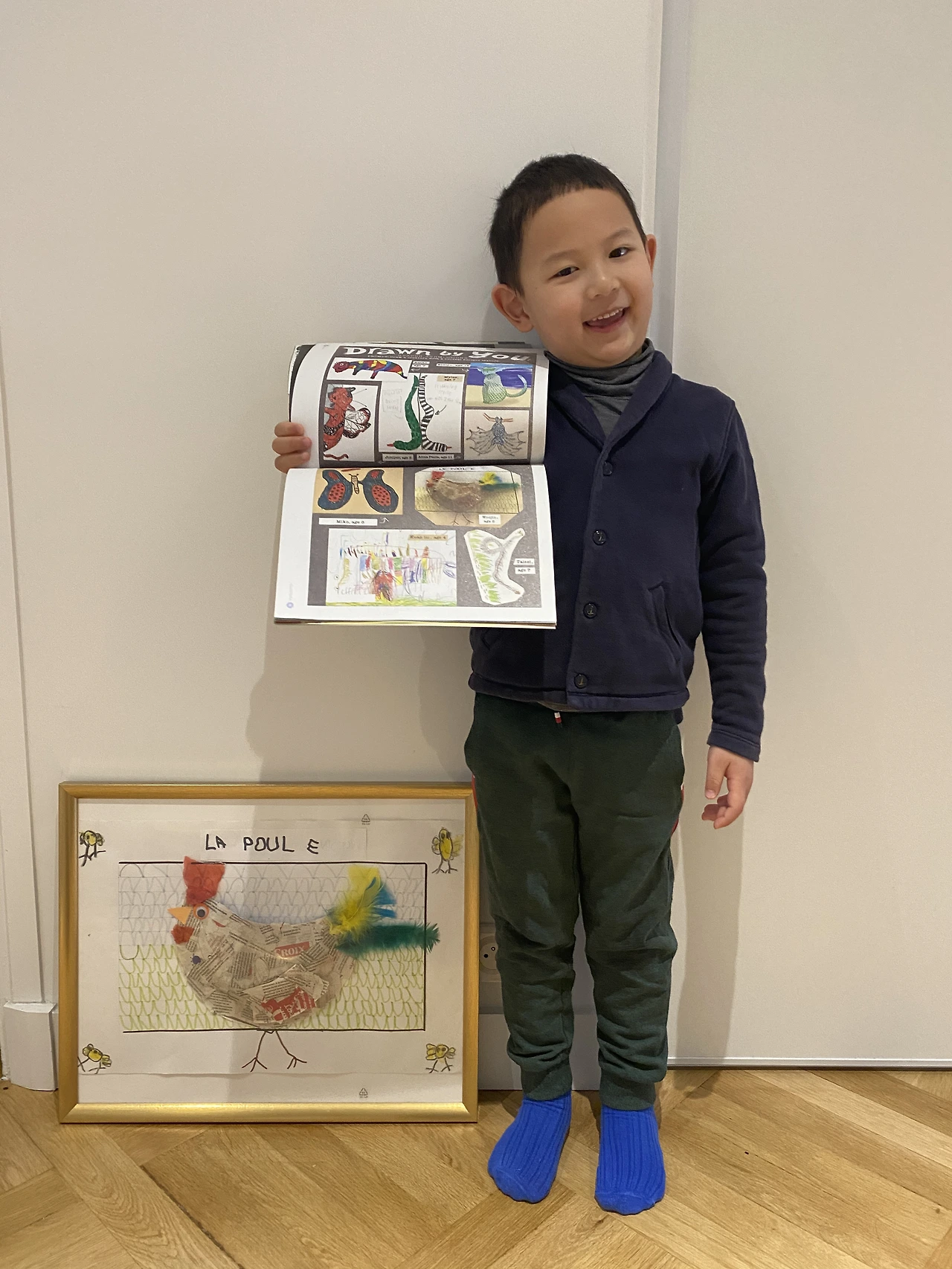 샌프란시스코에 사시는 하련님이 미국 키즈 매거진 illustoria 그림 공모전을 작년에 알려줬다. 아이가 그린 그림을 무심코 보냈고, 시간이 꽤 지나 잊고 있었는데, 한 통의 메일을 받았다. 그림을 채택되었고, 아이 그림이 실린 잡지를 집으로 보내주겠다는 것이었다. 아이가 그린 La Poule(닭) 그림이다. 비늘 달린 양, 털 달린 물고기처럼 실제 표피와 다른 질감으로 표현한 동물을 그리는 것이 주제였다. 아이의 닭 그림은 닭 털 대신 프랑스 신문을 오려서 붙였다. 종이로 된 닭 정도 되겠다.