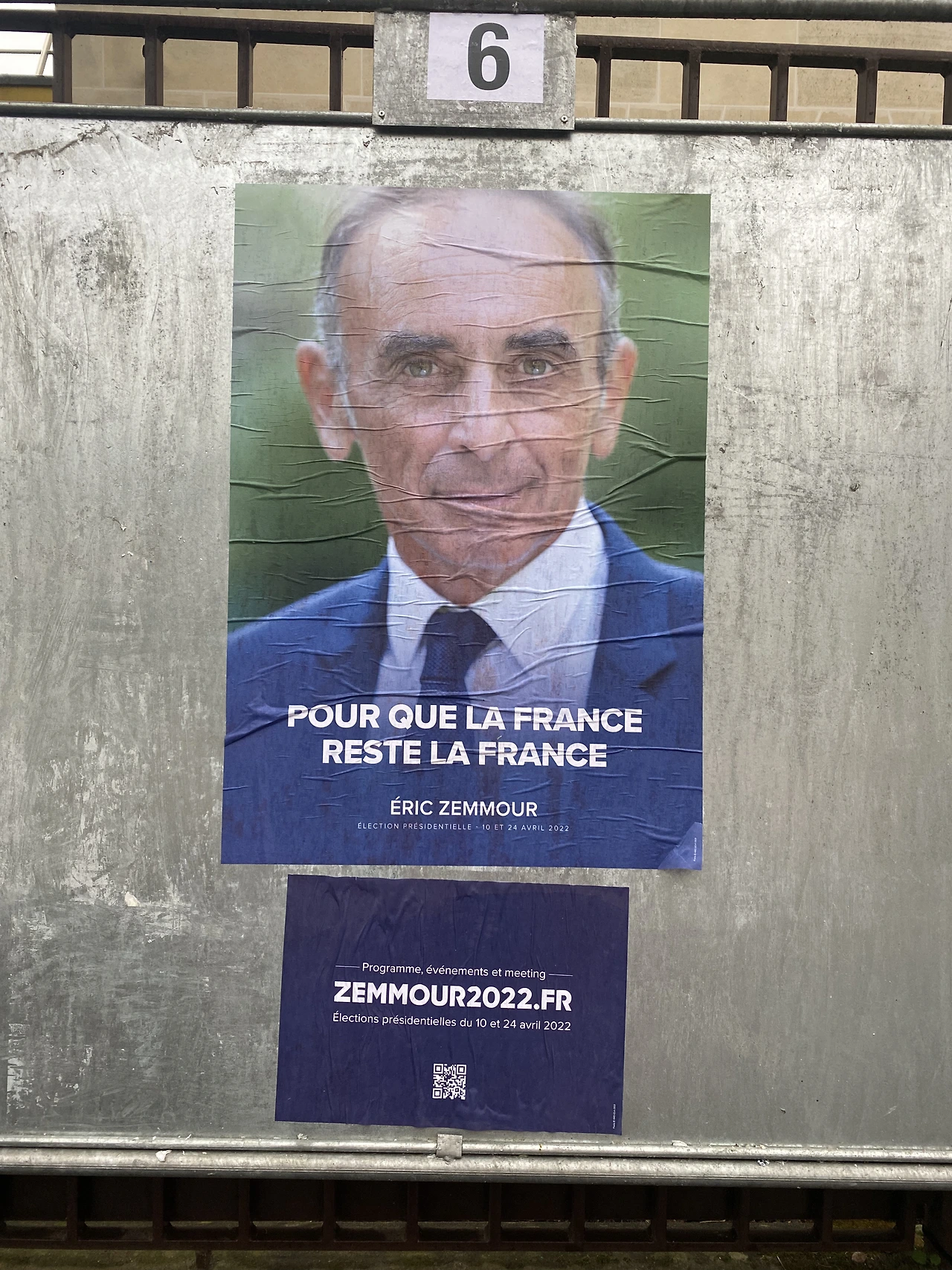 1958년 8월 31일 Montreuil에서 태어났다. 저널리스트, 작가, 수필가, 논쟁가를 거쳐 올해 대통령 후보로 갑자기 등장한 정치인. 마린 르펜은 진짜 극우가 아니라며, 후보 중에서 진짜 극우는 자신이라며 출사표를 던졌다. 파리 정치연구소 졸업 후 1986년부터 1994까지 Quotidien de Paris에서 언론기자로 일했다. 1966년 르 피가로(Le Figaro) 정치 부서에 합류하여 2009년까지 머물다가 2013년 복귀했다. 2021년까지 피가로 매거진에 칼럼을 썼다. 그가 쓴 책들은 성공을 거둔 동시에 논쟁을 불러일으켰다. 2014년 프랑스의 자살(Le Suicide Français)이 출간됐다. 1970년대 이후로 프랑스 국민들이 점점 약화되었다는데, 이는 5월 항쟁, 68세대의 영향을 받아 이렇게 됐다고 주장했다. 그는 프랑스의 트럼프로 불리는 초극 우파이다. 이민자, 특히 무슬림을 극단적으로 혐오한다. 참고로, 프랑스에서는 2020년 10월 중학교 교사가 대낮에 거리에서 무슬림에 의해 목이 잘리는 사건이 있었는데 이슬람 극단주의 세력 테러에 대한 강경책을 요구하는 시민들의 목소리가 높다. 프랑스는 유럽 국가 중에서도 무슬림이 가장 많은 국가다. 반무슬림 정서가 깊다 보니, 시민들 간에 긴장감이 돌 때가 많고, 나는 길을 다닐 때도, 지하철을 탈 때도 늘 불안 불안하다. 언제 어떻게 테러가 일어날지 모르기 때문이다. 그는 2011년 인종차별 선동과 2018년 무슬림 혐오 선동 혐의로 유죄 판결을 받은 바 있다. 2021년 말, 그는 2022 대선 출마를 선언하고 정당 Reconquete를 창당했다. 며칠 전, 그는 트로카데로에서 집회 연설을 한 적이 있다. 10만 명 프랑스인들이 트로카데로에 모였다. 전국에서 다 올라와서 관광버스 100대 이상이 일렬로 쭉 늘어선 신기한 모습도 봤다. 일요일이었던 그날 우리 가족은 샹젤리제에서 뇌이쉬르센 집까지 가는데 이날 집회 연설로 길을 여기저기 막아서 돌아 돌아 집에 도착했던 기억이 난다. 저기 모인 사람들 모두가 초극우파라는 생각을 하니, 동양인 이민자인 나는 겁이 났다. 최대한 피하는 게 상책이다. 벽보에는 프랑스가 프랑스로 남도록(Pour que la France Reste la France)라고 적혀있다.