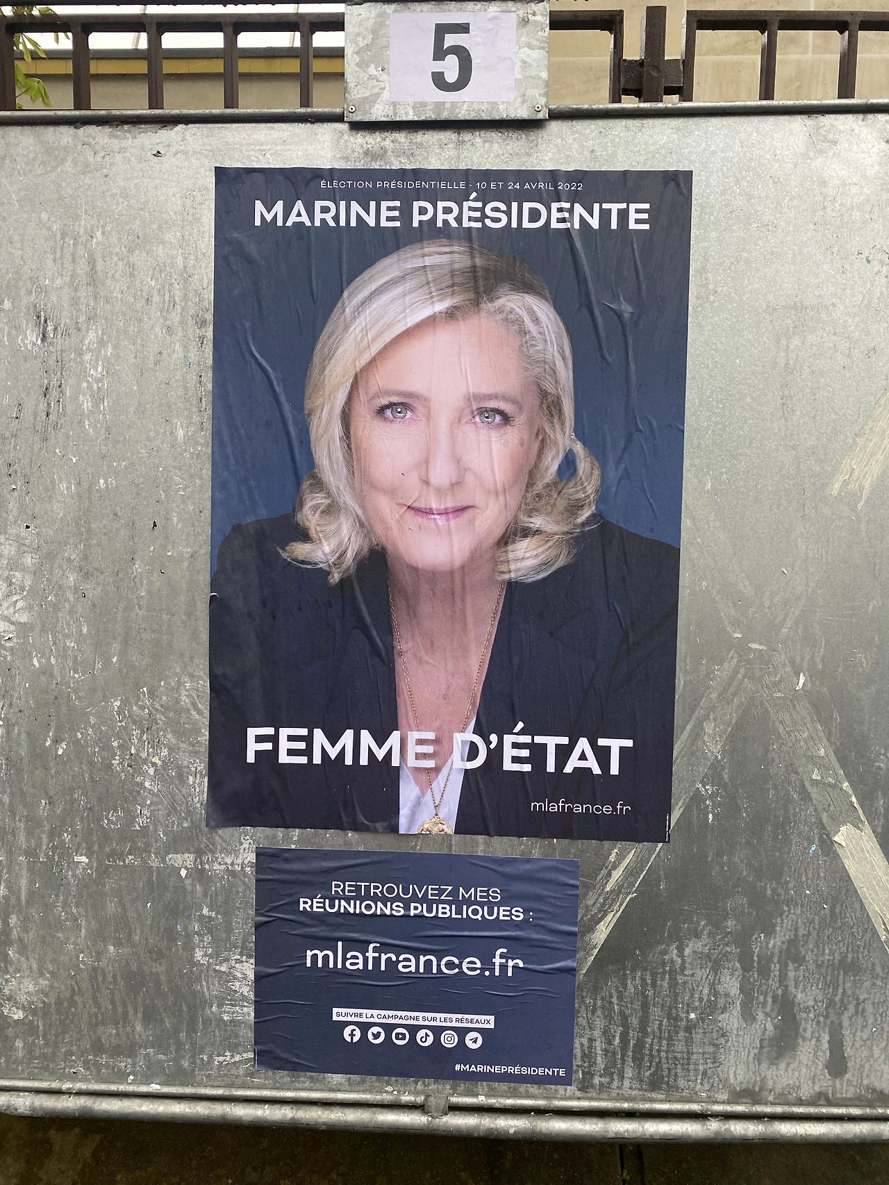 1968년 8월 5일 뇌이쉬르센에서 태어났다. 내가 사는 동네에서 태어나고 자랐네. 아버지는 Jean Marie Le Pen으로 마린 르펜은 아버지가 이끄는 주요 극우 정당인 국민 전선에 합류했다. 아버지도 정치인이었다. 5년 전 마크롱과 결선에서 붙었던 후보이다. 그녀의 언변에는 힘이 있다. 눈빛도 살아있다. 목소리가 약간 남성스러운 부분도 있고, 여성적인 면보다는 남성적이라는 느낌이 있는 후보다. 물론 당 대표라서 강한 면이 있어야 하기 때문이기도 하다. 그녀의 부모님은 각자 불륜으로 결국 이혼했다. 마린 르펜은 2번 이혼과 3번째 결혼 상대와는 현재 별거 중이다. 한국의 경우, 이혼 및 재혼 등 사생활이 정치 입문에 걸림돌이 되는 경우를 종종 본다. 구설수에 오르기 딱 좋다. 그러나 프랑스는 다른 것 같다. 24살 연상 교사와 결혼을 하든, 불륜이 있든, 이혼을 밥먹듯이 하든, 동거인과 살든 개인 사생활은 정치와는 분리해서 생각하는 것 같다. 사르코지 전 대통령도, 올랑드 대통령도 자유로운 연애로 유명하다. 한국인과는 참으로 많이 다른 정서를 가지고 있다. 벽보에는 대통령 마린이라고 적혀있다. 밑에는 Femme이라고 여성이라는 단어를 사용했다. 현재 지지도 2위인데, 오늘 기사에 따르면 바짝 따라붙어서 마크롱 대통령과 초접전을 펼치고 있다. 혜성같이 나타난 극우파 정당 에릭 제무르 덕분에(?) 그녀의 우파 이미지가 다소 순화됐다. 에릭 제무르가 워낙 초강수 극우 성향이다 보니 상대적으로 마린 르 펜 정당이 이득을 보고 있다. 그녀는 목걸이를 즐겨한다. 벽보에 보이는 목걸이는 금색의 줄이 긴 목걸이다. 안느 이달고와 발레리 페크레스처럼 늘 똑같은 목걸이만 착용하는 것은 아니지만, 그래도 몇 가지 목걸이를 번갈아 착용한다. 마린 르펜은 주로 줄이 긴고 펜던트가 비교적 큰 목걸이를 즐겨한다. 귀걸이를 착용하는 것은 거의 못 봤다.