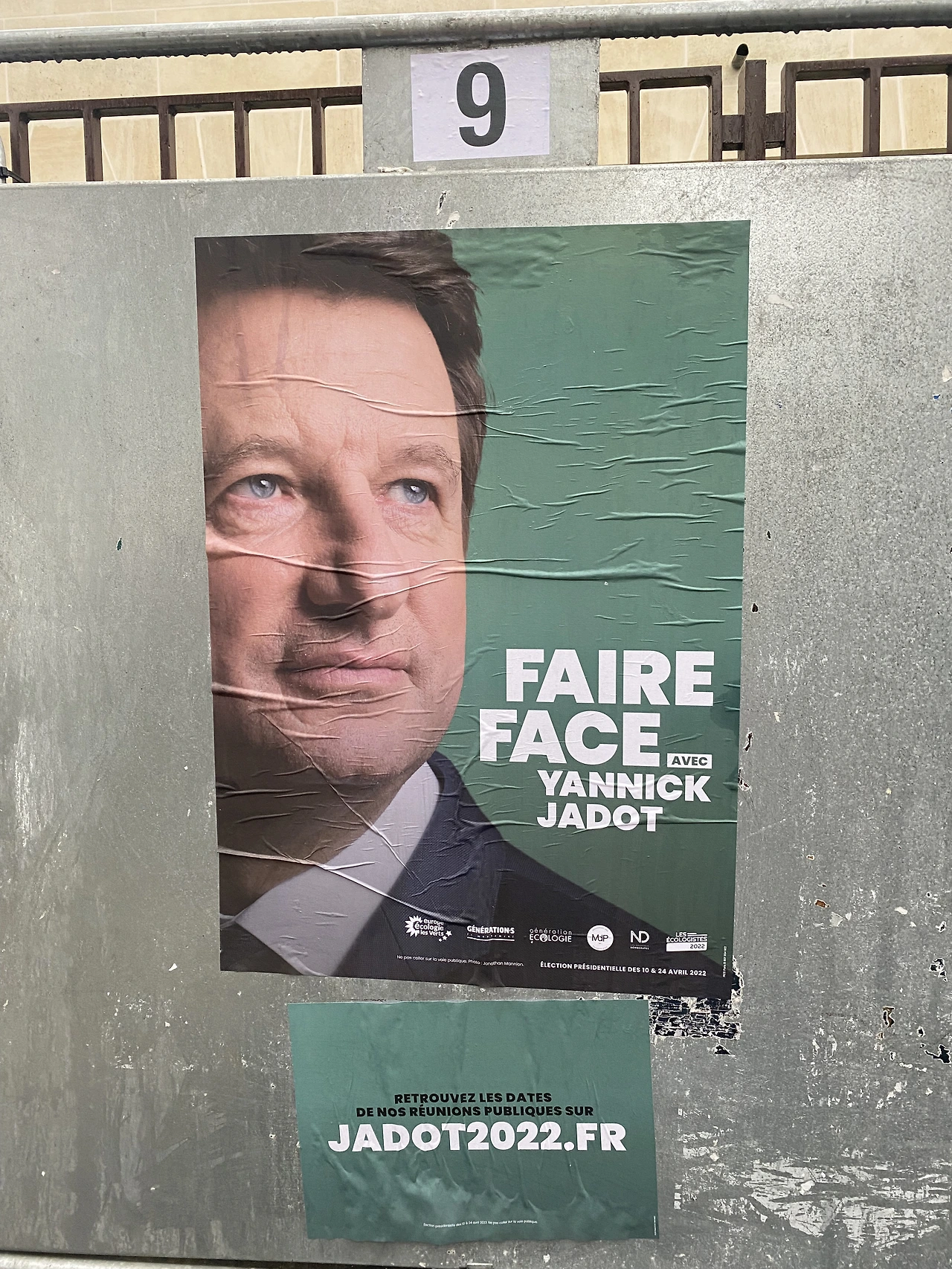 1967년 7월 27일, Clacy-et-Thierret에서 태어났다. 프랑스 환경 운동가이자 정치가이다. 1999년부터 녹색당 일원이었고, 2002년부터 2008년까지 그린피스 프랑스 캠페인 책임자였다. 벽보에는 야닉 자도와 대처하다(Faire Face avec Jannick Jadot)라고 적혀있다.