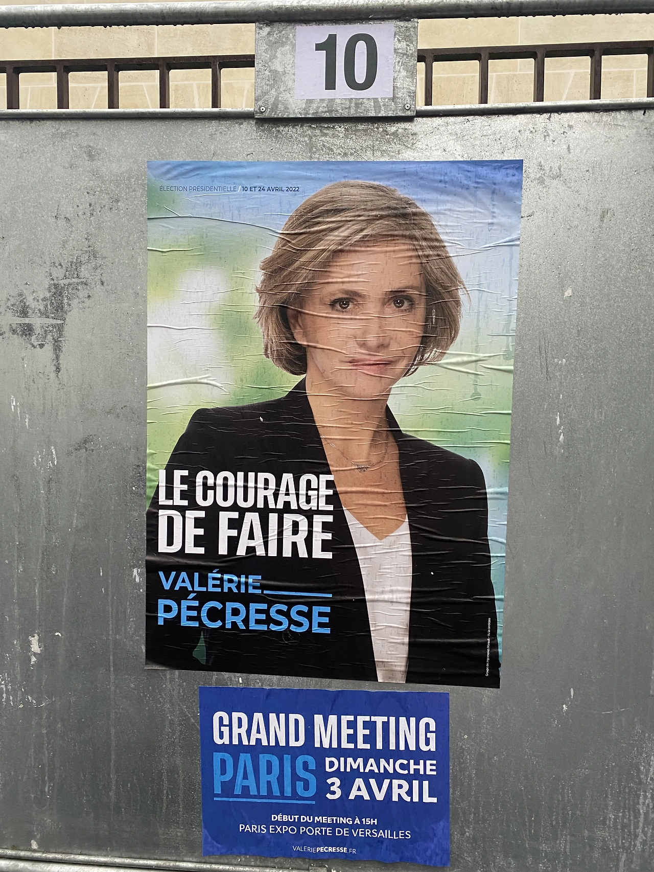 1967년 7월 14일 뇌이쉬르센에서 태어났다. 와우, 이 후보도 내가 사는 동네에서 태어나고 자랐네. HEC 및 ENA를 다녔다. 1992년부터 2015년까지 국회의원이었다. 1992년부터 1998년까지 파리정치연구소에서 강의했다. 2015년부터 현재까지 일드프랑스 광역의회 의장을 역임하고 있다. 그녀는 Bolloré 그룹 내 Bolloré Telecom 전 사장인 Dominique Roux와 Catherine Bertagna의 딸이다. 그녀의 외할아버지 루이 베르타냐(Louis Bertagna) 정신과 의사였다. 1994년 8월 6일에 그녀는 Imerys의 부총책임자이자 당시 Alstom의 부사장이었던 Jérôme Pécresse와 결혼했다. 이들 사이에 세 자녀가 있다. 부르주아 집안이다. 어릴 적부터 유복했음을 알 수 있다. 엘리트 코스를 차근차근 밟고 올라왔다. 후보들 중에서 이혼 또는 불륜 스캔들, 사생활에 특이점이 없는 편이다. 이건 프랑스 사람들에게는 큰 이점으로 다가가진 않는다. 개인 사생활, 가족사는 크게 개의치 않는 편이니까. 벽보에는 하는 용기(Le Courage de Faire)라고 적혀있다. 그녀도 귀걸이는 잘 착용하지 않고, 늘 하고 다니는 똑같은 목걸이가 있다. TV에서 봤을 때는 잘 안 보였는데, 이번에 벽보를 통해 자세히 들여다봤다. 작은 은색 하트 두 개가 서로 겹쳐있다. 늘 하고 다니는 목걸이다. 이 목걸이는 그녀에게 어떤 의미가 있는 걸까? 부모님이 물려주신 걸까? 남편이 준 걸까? 왜 대부분의 프랑스 여성 리더들은 목걸이를 늘 착용하고 있는 걸까? 그것도 매일 같은 것으로만. 뭔가 그들에게 수호신 같은 역할을 하는 물건인가 보다고 짐작만 할 뿐이다.