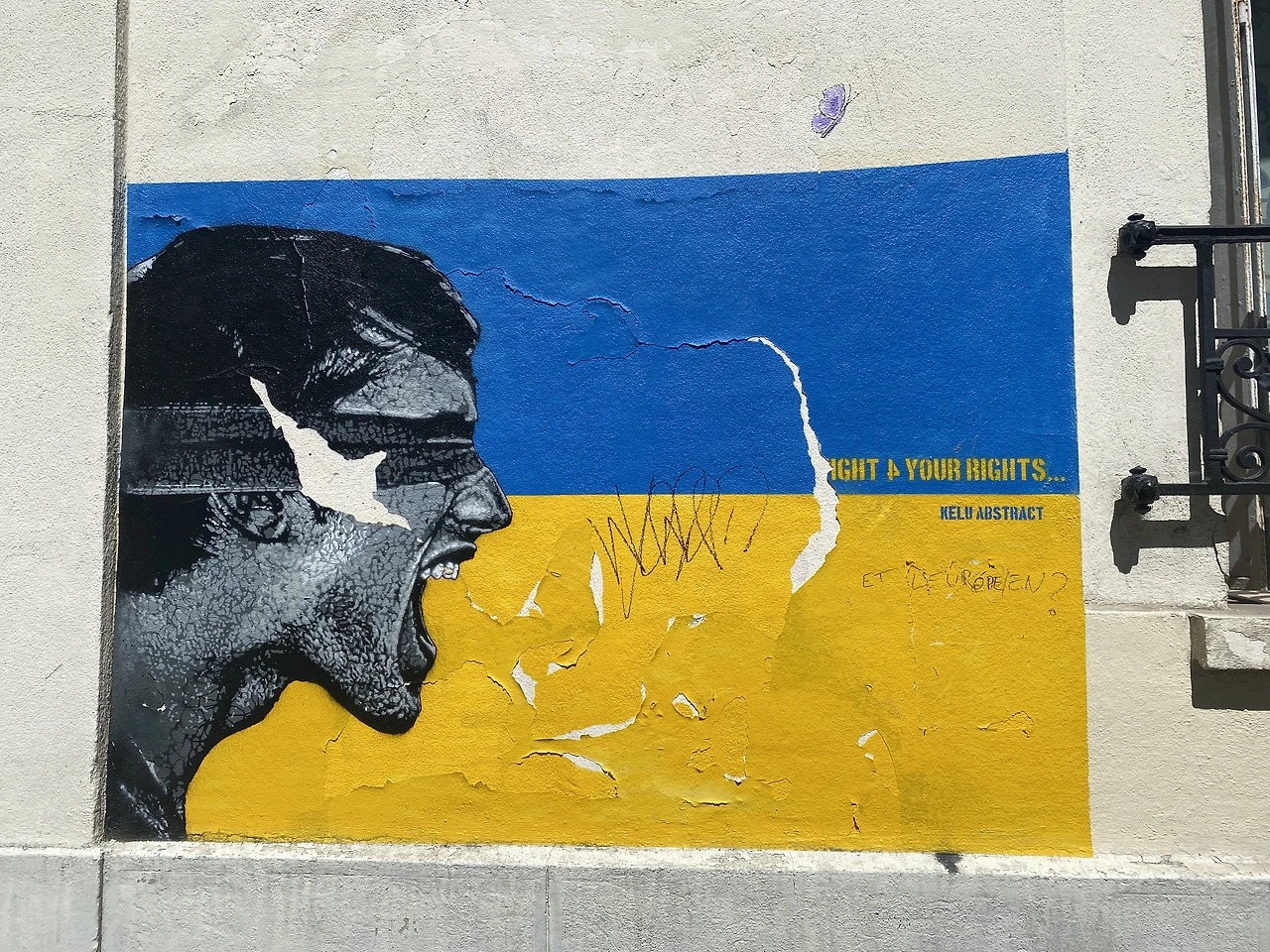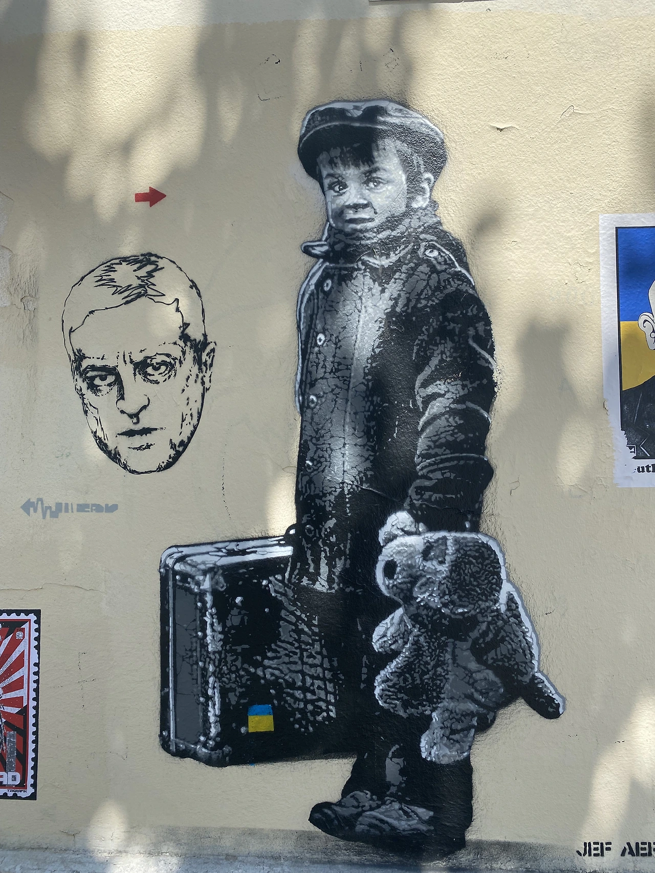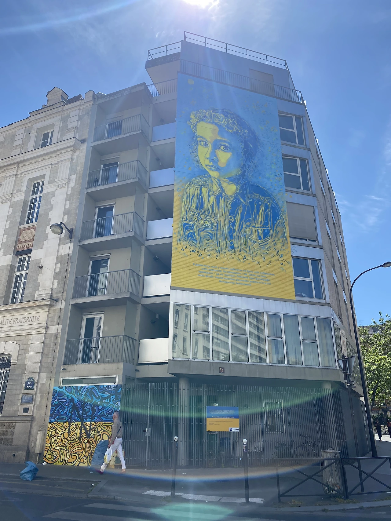 파리 13구에 있는 한 아파트 외관 4층에 걸쳐 설치된 그의 작품을 한참 동안 고개를 들어 올려다봤다. 13구 시청과 협력하여 이번 우크라이나 평화 관련 작품을 만들었다. 파란색과 노란색 두 가지 색깔로 우크라이나 소녀의 프레스코화를 그렸고, 그 밑에 젤렌스키 우크라이나 대통령이 한 말을 적어뒀다. "나는 신도 우상도 아니며, 국가의 하인일 뿐이기 때문에 사무실에 내 사진이 걸려 있는 것을 원치 않는다. 대신 아이들의 사진을 걸어 놓고 당신이 결정을 해야 할 때마다 보세요." 정말 멋진 말이다. 중요한 결정을 해야 할 때, 아이들을 가장 우선으로 생각해라는 그의 말은 우리가 참으로 마음 깊이 담아야 할 부분이다. 그가 어떻게 코미디언에서 한 국가의 대통령이 되었는지 알 수 있을 것 같다.