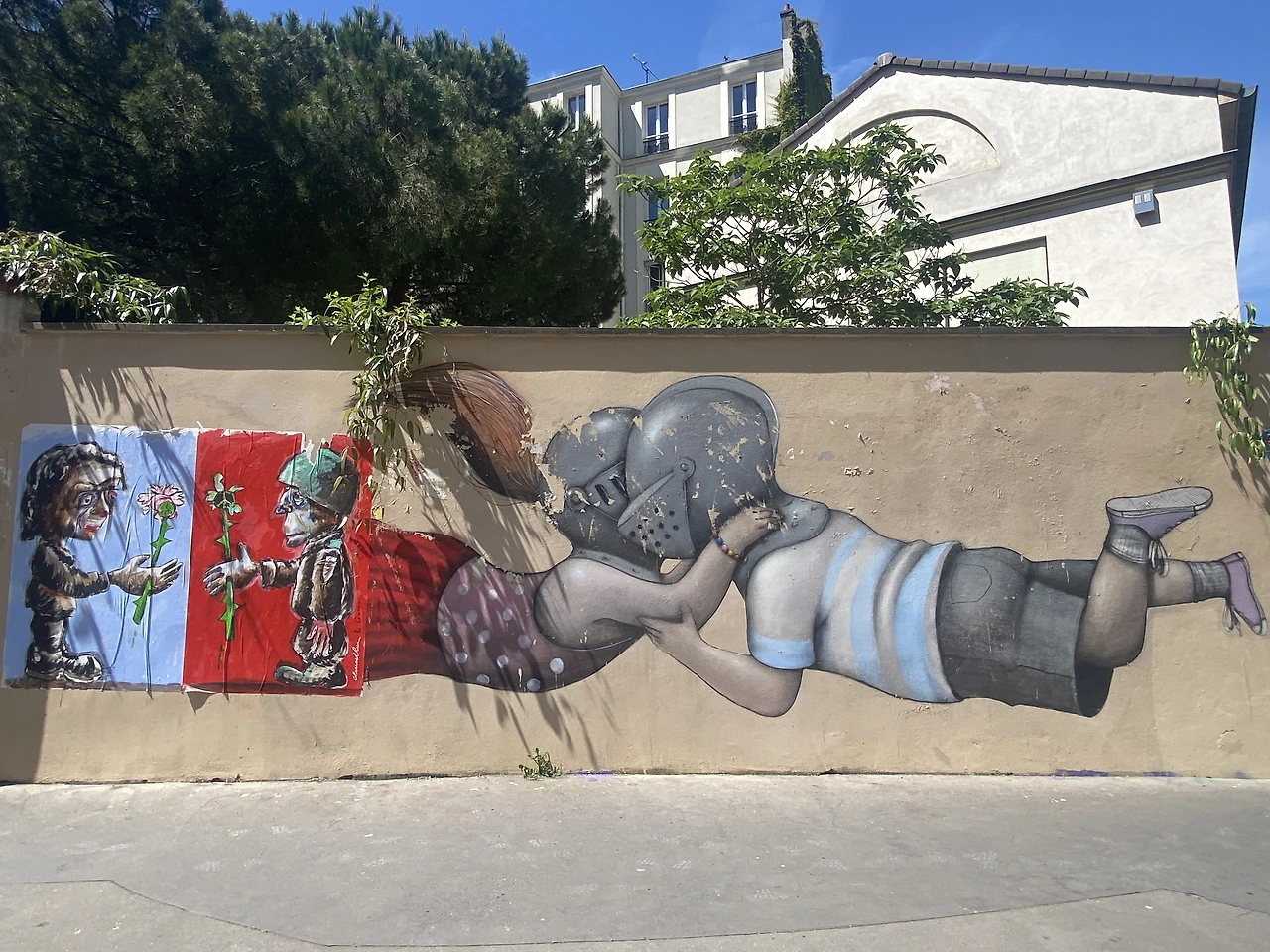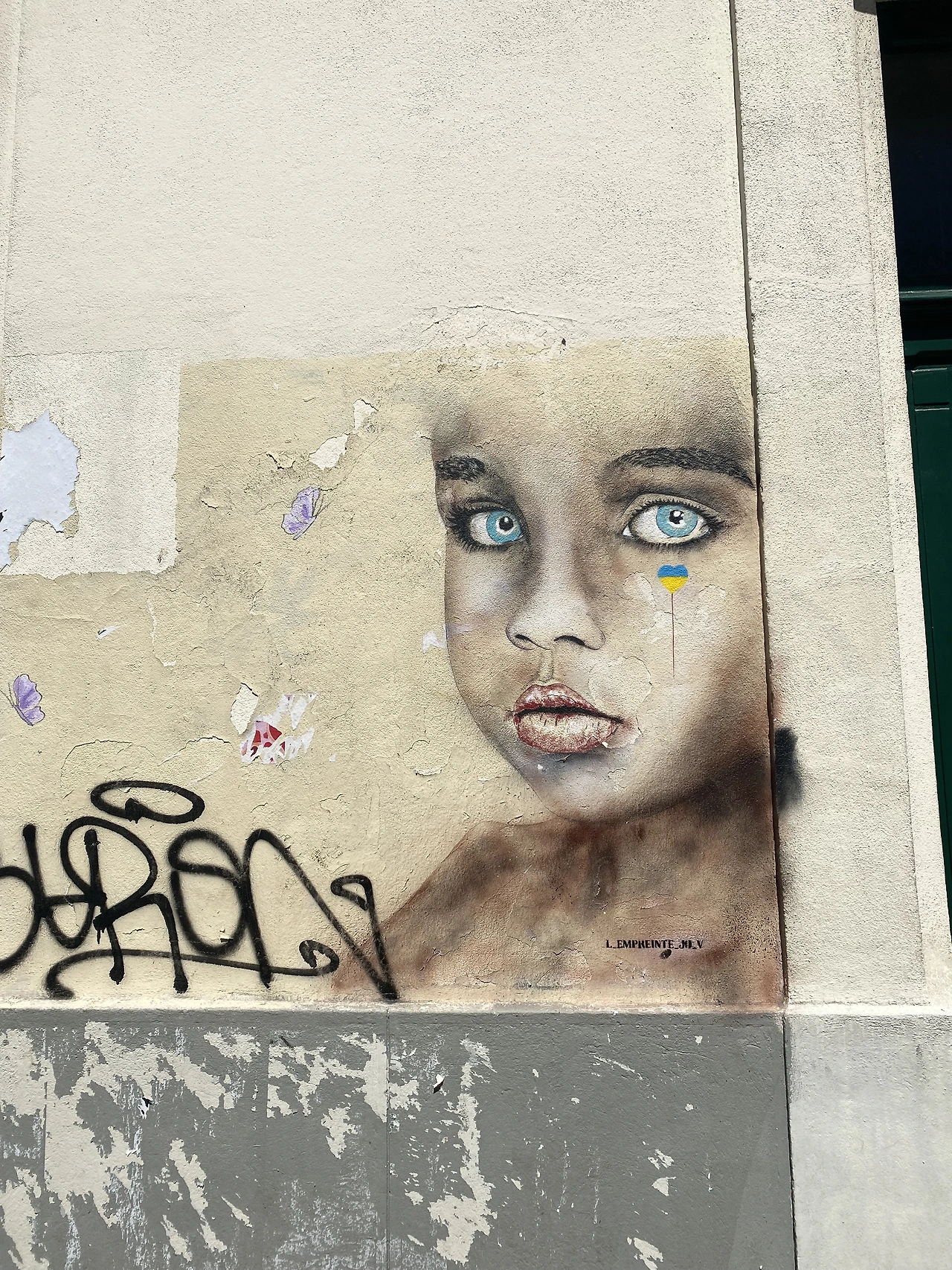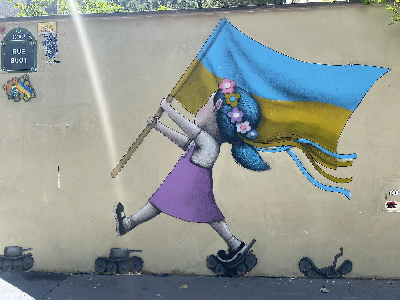 파리 13구에 우크라이나 평화를 위한 벽화를 유명한 화가들이 그려놨다는 정보를 입수해서 두 눈으로 직접 보고, 사진을 찍으러 찾아갔다. 구글 지도를 따라 찾아간 곳은 Rue Buot. 우크라이나 소녀가 장갑차를 밟으면서 앞을 향해 걸어가고 있었다. 세스(Seth)라고 불리는 스트리트 아트로 유명한 예술가의 작품이다. 2월 27일 그렸다. 전쟁 발발 3일 후, 그는 이곳에 직접 와서 그렸다. 벽화를 한참을 바라봤다. 그가 늘 주요한 매개체로 사용하는 어린아이를 통해 사람들에게 메시지를 전하고 있다. 우크라이나 소녀는 장갑차보다 훨씬 크게 그렸다. 그만큼 전쟁에 사용되는 장갑차보다 한 소녀가 더 힘이 있고, 크다는 것을 보여준다. 전쟁 중에 무고한 시민과 어린아이들이 죽었다. 하지만 그는 실제 아이가 더 힘이 있다는 것을, 아이가 사람이 더 크고 값지다는 것을 보여주고 있었다. 담장 위로 나뭇잎이 넘실 거렸다. 개미가 벽 위를 기어갔다. 땅과 벽 사이에는 잡초가 자라고 있었다. 그 옆에는 꽃도 있었다. 5월의 봄내음이 함께 어우러졌다. 햇빛이 벽화를 비추고 있었다. 자연 속에서 있는 그대로의 예술 작품이었다. 온도와 습도를 정확하게 맞춘 강화 유리벽에 고이 모셔둔 모나리자의 인공적인 느낌이 아닌, 자연의 온도, 습도, 빛, 공기 속에 살아있는 예술 작품이었다.