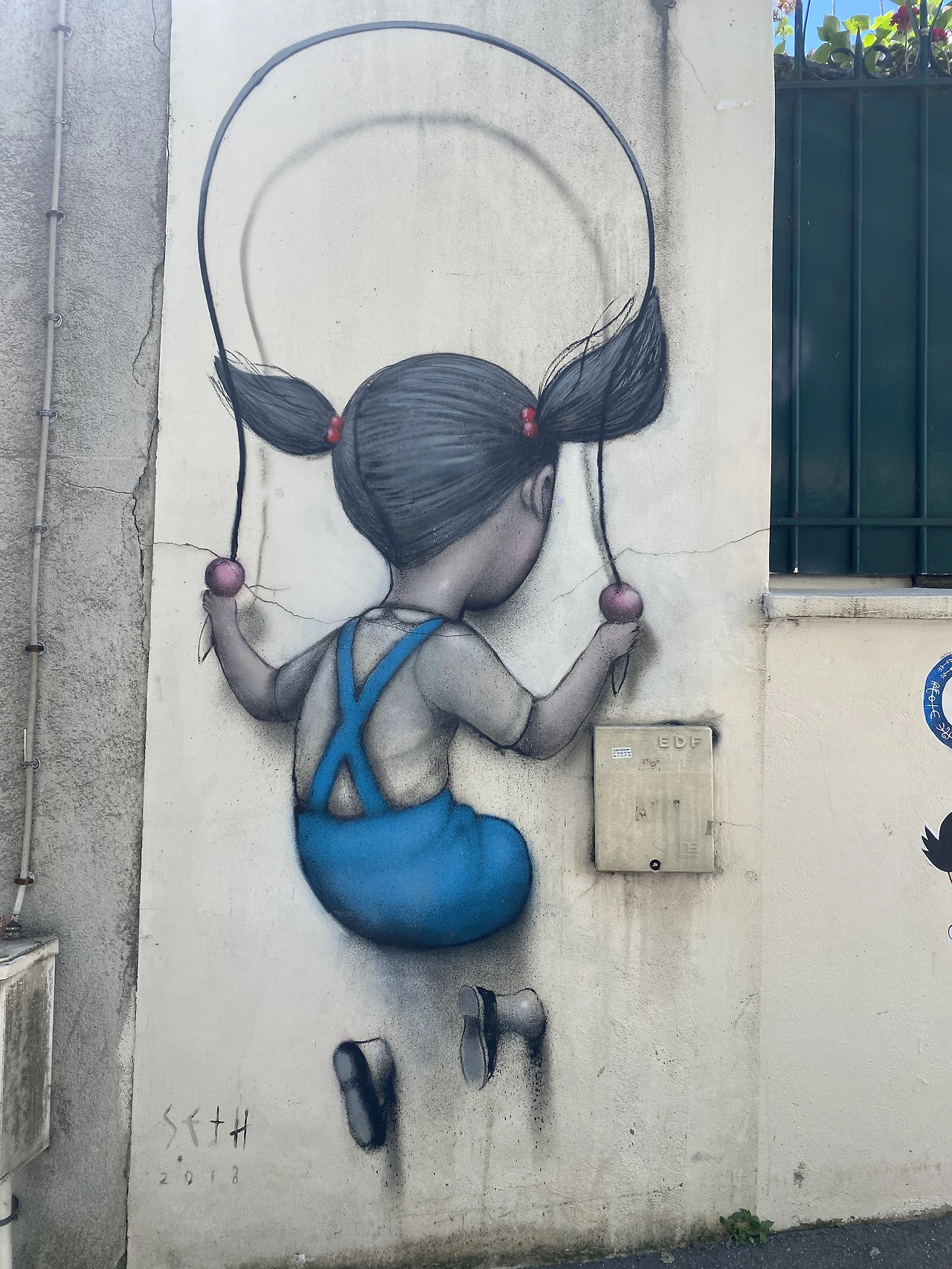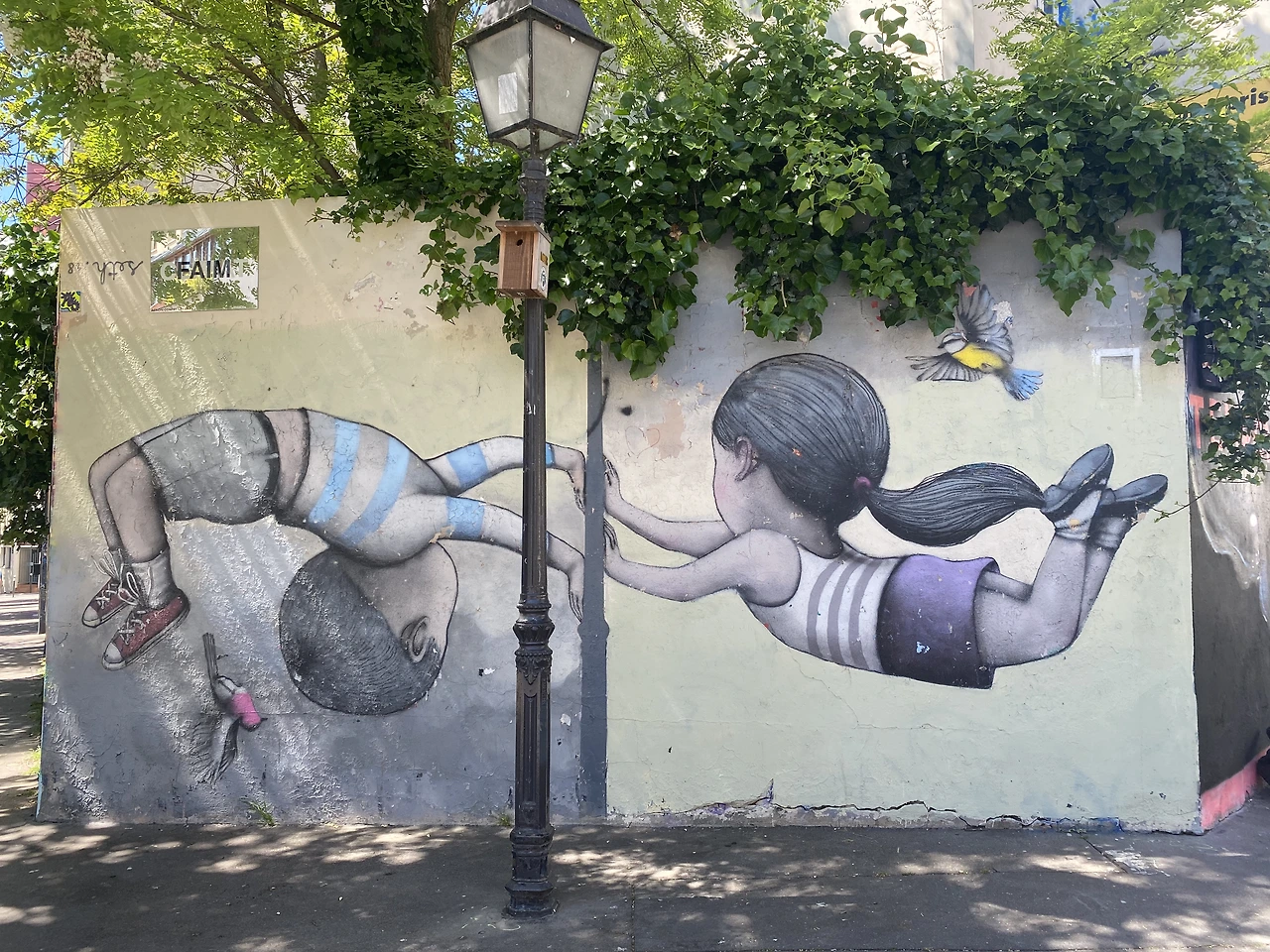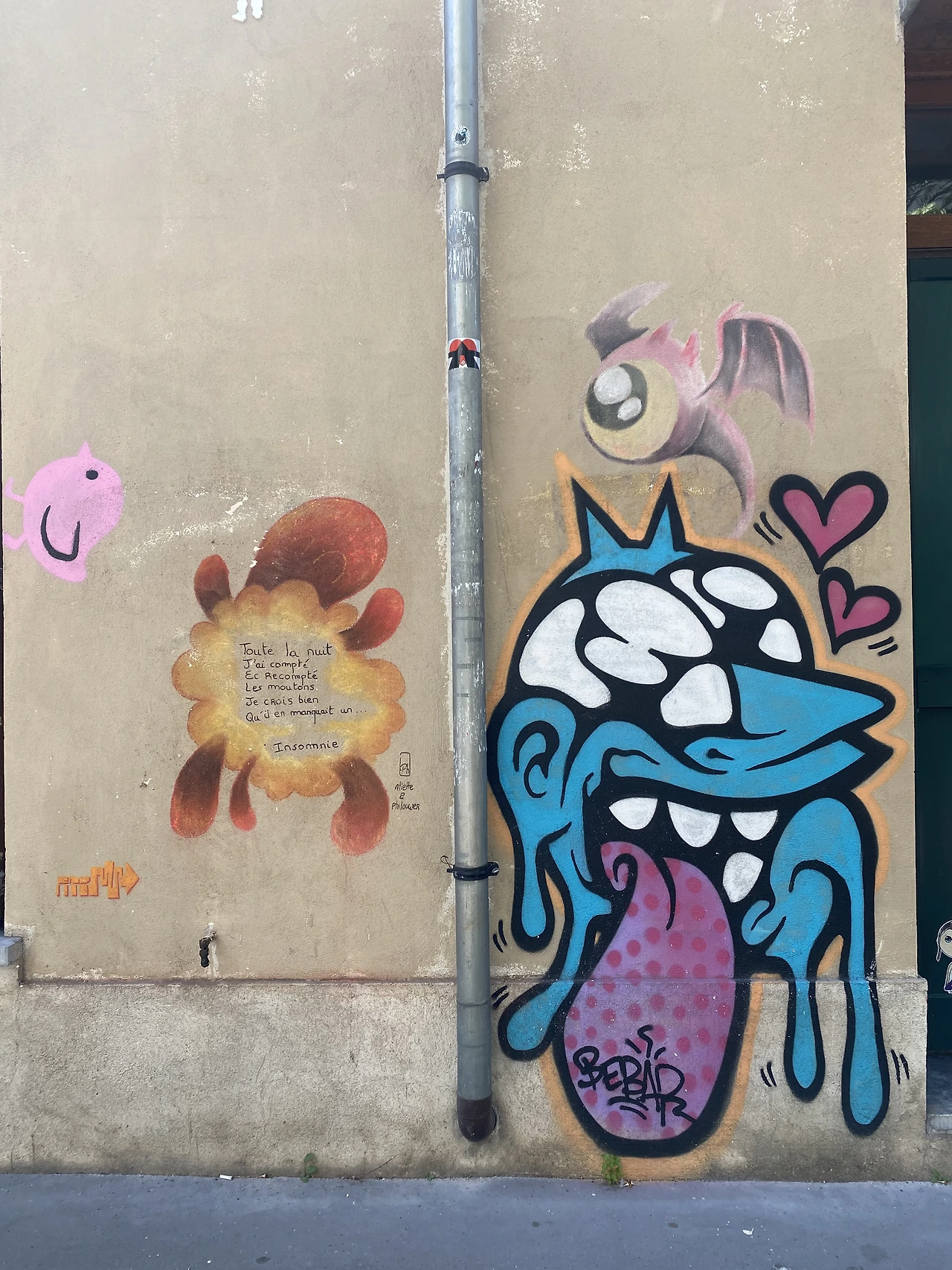 이 외에도 거리 곳곳에는 벽화가 많았다. 벽화를 감상하고 있는데, 건물 위층에서 중국인들의 대화 소리가 들렸다. 이곳은 중국인들이 많이 사는 동네라는 것을 실감했다. 건물이 낙후되어 보였다. 많이 낙후되어 보이는 건물도 곳곳에 보였다. 이 거리에 혼자 덩그러니 서 있으니, 마치 중국에 온 듯한 느낌이 들었다. 중국어가 내 머리 위로 계속 들렸다. 이곳에 탕프레라는 큰 중국 마트가 있는데, 한국인들이 이곳에 많이 장을 보러 간다고 들었다. 나는 중국 마트를 이용하지 않으며, 한인 마트를 주로 이용하는 편이다. 생소한 동네를 걸으니, 참 파리는 구마다 다양한 느낌이 있다는 생각이 들었다. 그리 멀지 않은 곳에 루브르, 오르세, 퐁피두가 있는데, 그곳과 느낌이 사뭇 달랐다.