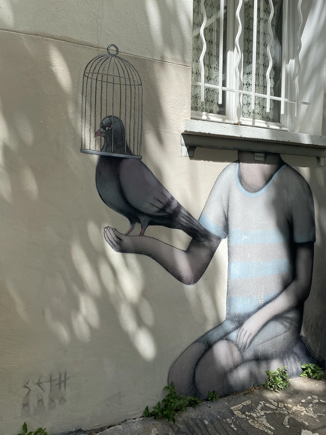 아이를 주제로 한 그림이 실제 곳곳에 많았다. 다른 그림이 눈에 띄었다. 무릎을 꿇은 한 아이가 목은 창문에 들어가서 보이지 않는다. 손에 비둘기 한 마리가 앉았는데 새도 목만 새장에 갇혀있다. 둘 다 몸은 바깥에 있지만 목 위로는 집안에, 새장에 갇혔다. 세스는 작품 속 어린아이와 새를 통해 사람들에게 어떤 메시지를 전하고 싶었던 것일까? 내 개인적인 생각을 자유롭게 말해보자면, 몸은 바깥에서 자유로울지 모르지만 정신세계는 집안에 갇혀 있다는 것이 아닐까. 아이들은 자유로운 사고를 해야 하는데, 집에, 학교에, 어딘가에 갇혀서 자유롭고 창조적인 그들만의 세계를 훨훨 펼쳐나가지 못하고 있다는 것을 말하고 싶은 것은 아닐까. 새가 자유롭게 날지 못하는 것처럼 아이도 새처럼 머리가 창문 안에 갇혀서 자유롭게 세상을 향해 날아가지 못하는 것이 안타깝다는 그런 메시지로 나는 읽었다. 그림 해석에 정답은 없으니 자유롭게 상상할 수 있다.