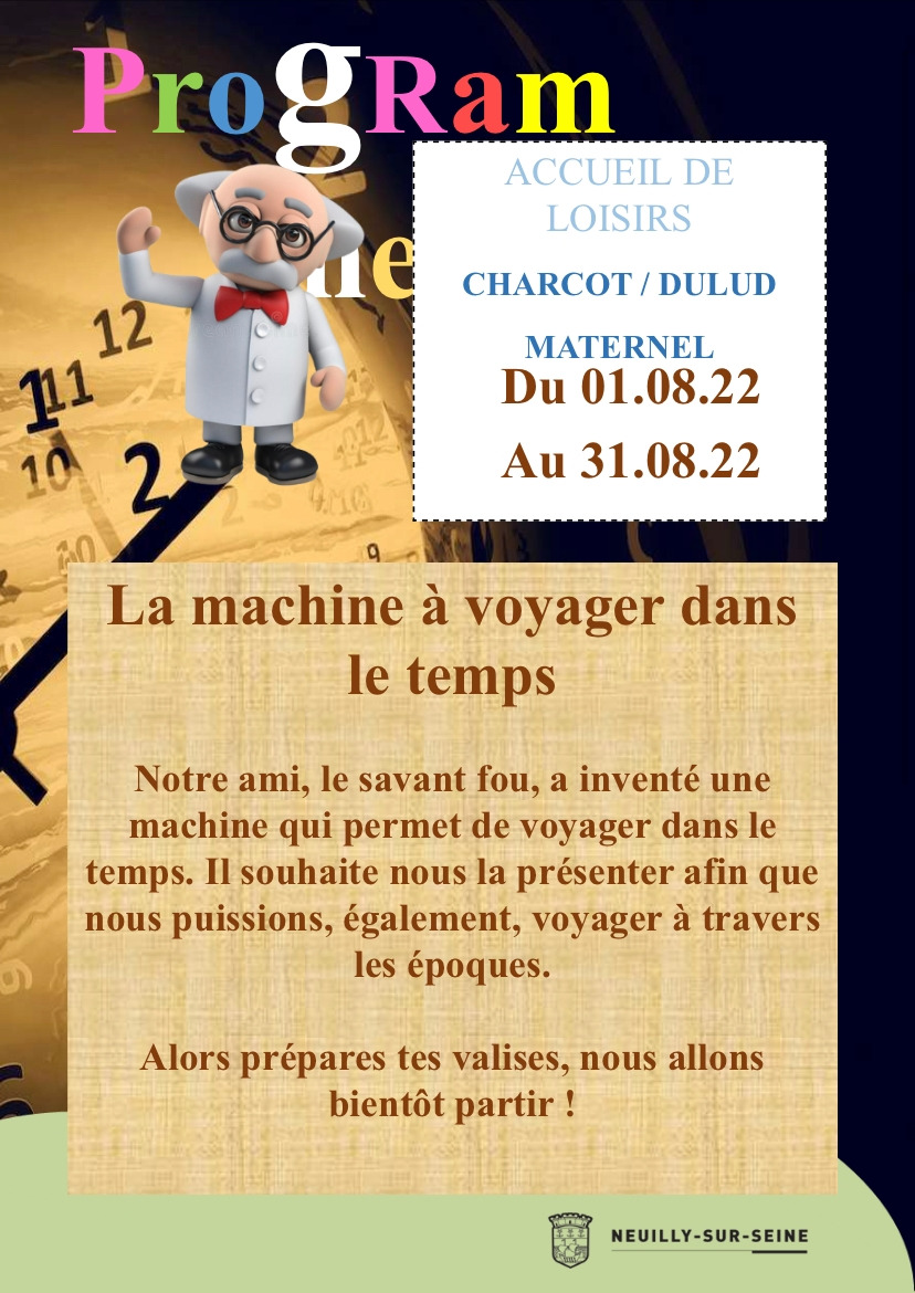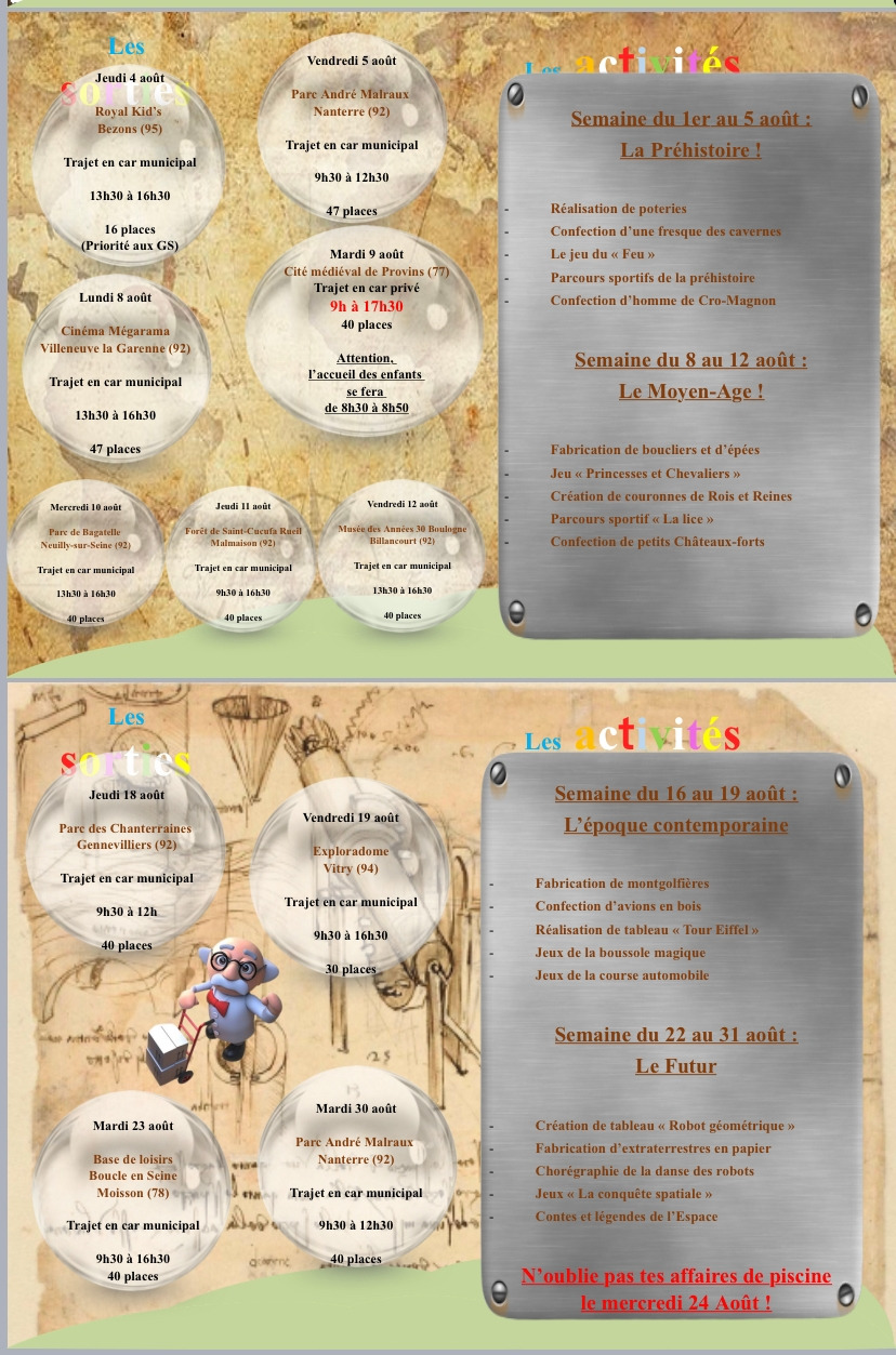 8월 테마는 시간 여행이었다. 선사 시대, 중세 시대, 현대, 미래 이렇게 4개의 시간대로 나눠서 각 주마다 그 시대의 특징을 경험하고 시간 여행을 하는 테마였다. 아이들에게 시간관념 및 역사에 대해 재미있게 접근하는 방식인 것 같았다. 테마에 맞게 과거 중세 시대를 경험하는 뮤지엄을 가는 일정도 있었다. 아쉽게도 하필이면 이날 우리 가족이 행정적으로 다 함께 가서 처리해야 할 일이 생겨서 참석하지 못했다. 일이 생겨서 가지 못한다고 말하면 그날은 자동 결석인데, 그래도 비용은 청구된다. 신청을 미리 했기 때문에 결석하면 본인 손해다. 파리 근교에 있는 각종 성에도 간다. 시에서 제공하는 버스를 타고 선생님과 아이들이 함께 간다. 점심이 제공된다. 비용은 여름학교 비용과 급식 비용이 청구된다. 오전 9시부터 오후 6시 반까지 운영하며(오후 5시부터 아이를 찾아갈 수 있다), 하루 종일 아이들을 봐주고 놀아주고 야외 활동을 하는데 비용은 한국의 학원비에 비하면 매우 저렴한 편이다.