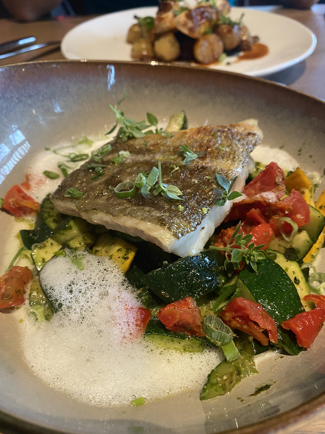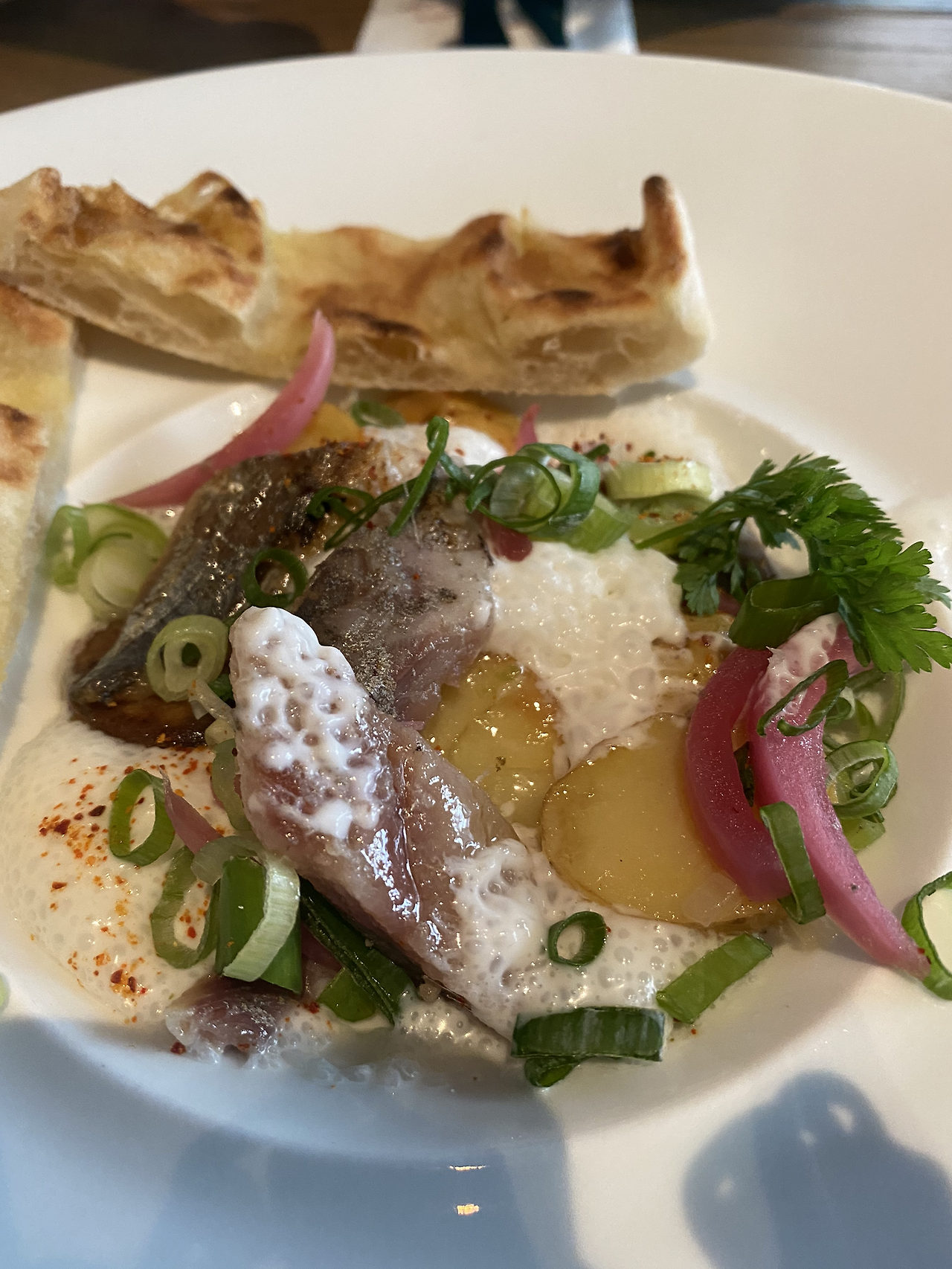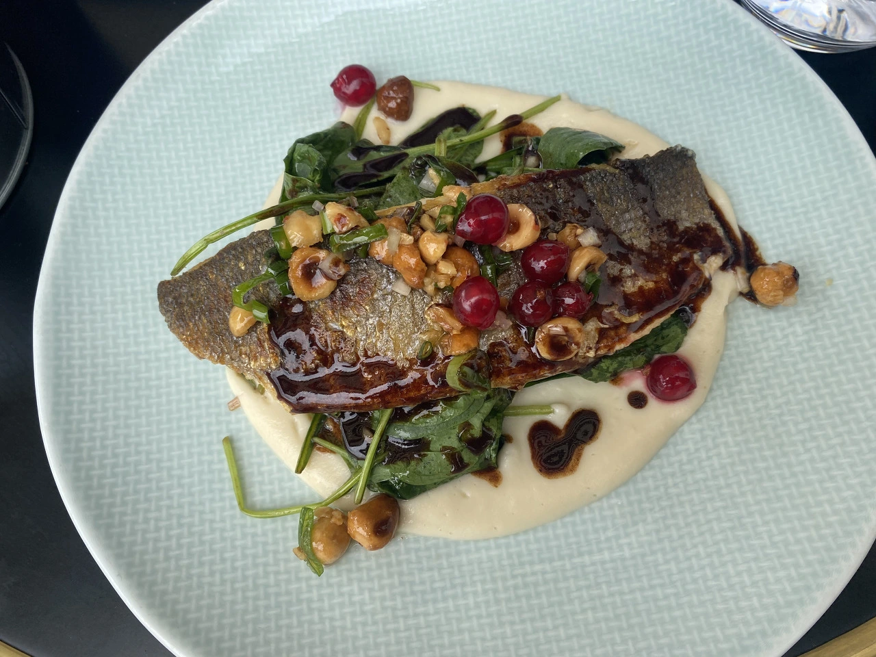 본식으로 신랑이 주문한 돼지고기 요리가 나왔다. 삼겹살을 통째로 내왔고 밑에는 통감자 조림과 무화과 같은 것이 함께 곁들여져 나왔다. 소스가 독특했다. 고기도 부드러웠다. 내가 주문한 생선 요리는 콜리플라워 무슬린을 바탕으로 생선이 구워져나왔다. 레드 와인을 소스로 곁들였다. 너트와 시금치가 곁들여져 있었다. 같이 나온 바게트 빵도 일반적인 바게트가 아닌 독특한 맛을 내는 고소한 빵이었다.