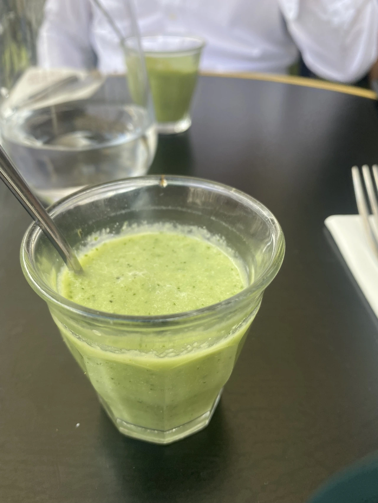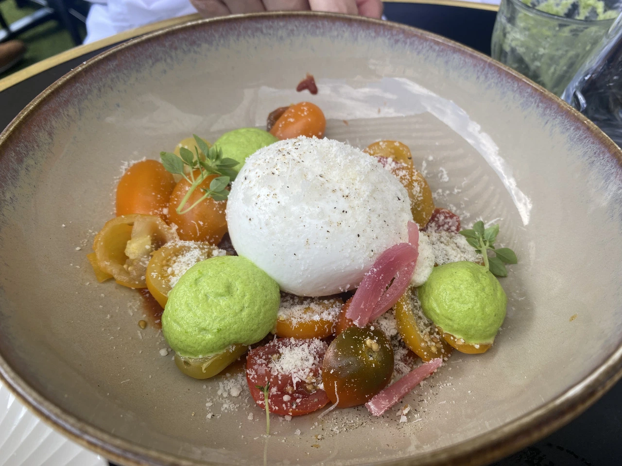 단품은 The Fork 라는 앱을 통해 예약하면 30%할인해준다. 점심 세트 메뉴는 할인이 안된다. 점심 세트 메뉴는 39.99유로이며, 단품은 28유로 정도이다. 가장 먼저 아뮤즈부쉬가 나왔다. 아뮤즈부쉬(Amuse-bouche)는 글자 그대로 입을 즐겁게 한다는 뜻이다. 아뮤즈는 즐겁게하다, 부쉬는 입이라는 뜻을 가진 프랑스어다. 아뮤즈부쉬는 한 입 크기로 준비한 요리로 식사 전 차갑게 먹거나, 식전주를 마실 때 같이 먹는다. 오이를 갈아서 바닐라 크림 및 식초와 섞은 것인데 매우 상큼했다. 오이향이 강하게 전해졌다. 전식으로 부라타 치즈를 중심으로 식초를 곁들인 방울 토마토가 함께 나왔다. 루꼴라 사이펀은 연두색으로 거품이 톡쏘는 맛과 함께 상큼했다. 부리타 치즈에는 굵은 소금을 뿌렸는데 치즈와 잘 어울렸다.
