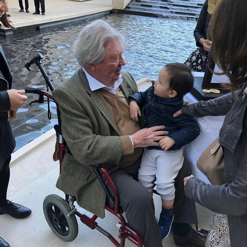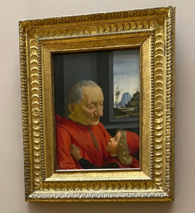 그렇다가 갑자기 무대 뒤편에서 밴드 음악과 함께 마카롱을 매우 높이 쌓아 올려서 만든 케이크가 등장했다. 그렇더니 야외로 밴드가 나갔고, 조금 있으니 장 자크 상페 할아버지가 등장하셨다. 옆에는 부인인지 누구인지는 모르겠지만 상페를 극진히 케어했다. 우리도 덩달아 야외로 나갔다. 아이는 상페 할아버지 가까이 다가갔고, 그가 우진이를 무릎 위에 앉혔다. 나는 사진을 찍었고, 그는 우진이를 지그시 바라봤다. 어떠한 말은 없었지만, 그냥 우진이 눈을 지그시 물끄러미 약 5~6초 정도 응시하셨는데, 마치 아이에게 눈으로 어떤 메세지를 전달하는 것처럼 느껴졌다. 동시에 동양의 한 아이를 통해 느끼는 그의 어떠한 새로운 감정이 느껴지기도 했다. 낯선 할아버지를 바라보는 우진이는 무슨 생각을 했을까. 낯선 할아버지 무릎에 갑자기 앉아서 동요하거나 울 수도 있는데 전혀 그런 기색 없이 아이도 가만히 할아버지를 물끄러미 바라봤다. 서로 처음 만났지만 알 수 없는 이끌림에 의해 서로 만났고 둘은 어떤 깊은 교감을 나누는 듯 보였다. 마치 루브르 박물관 드농관에 있는 기를란다요 작품 <노인과 손자>가 떠올랐다. 가만히 보니 작품 속 할아버지가 상페를 닮은 것 같기도 하다. 코 부분이 특징인데 비슷한 느낌을 풍긴다.
