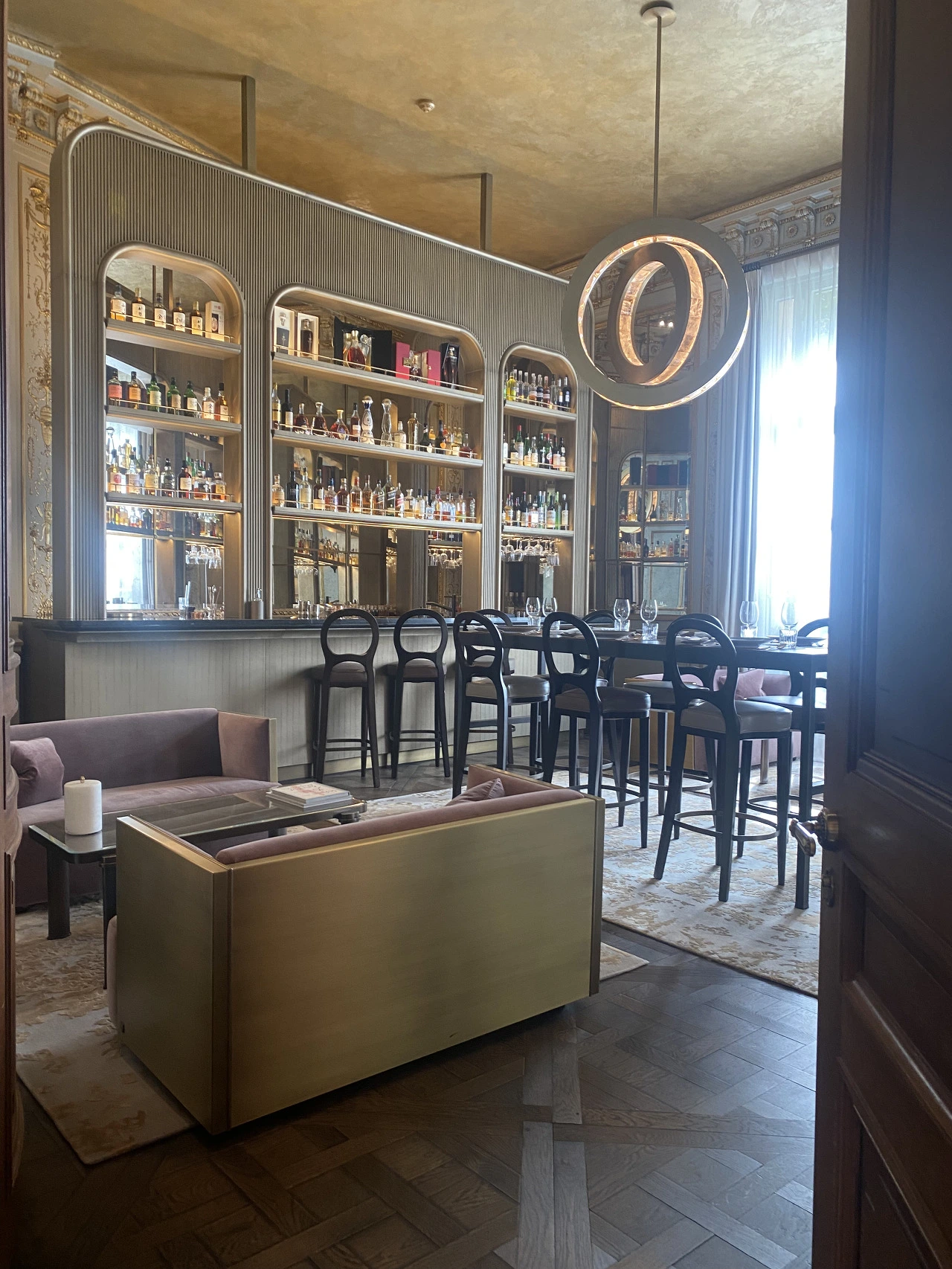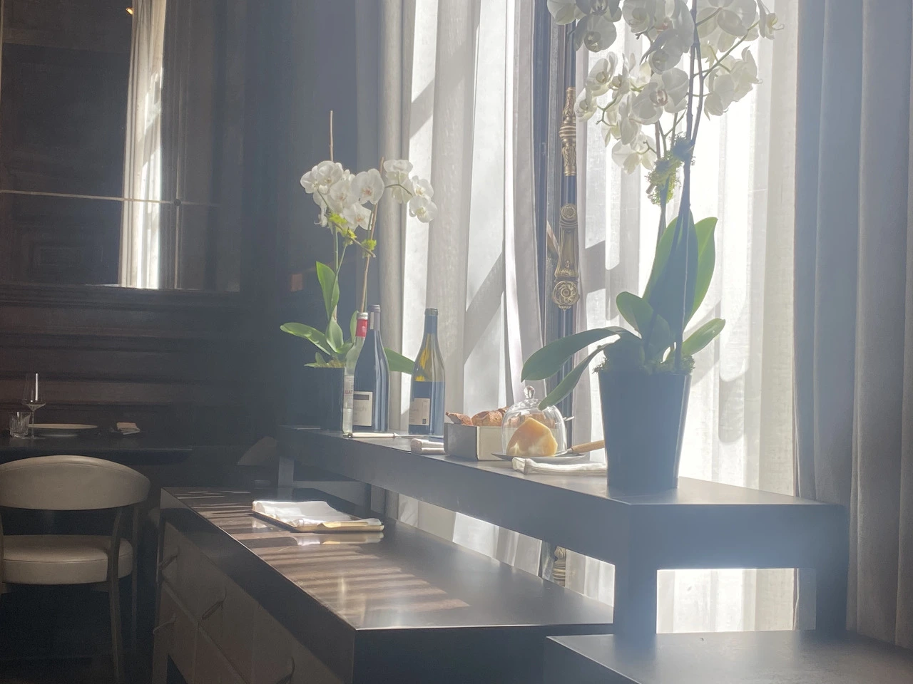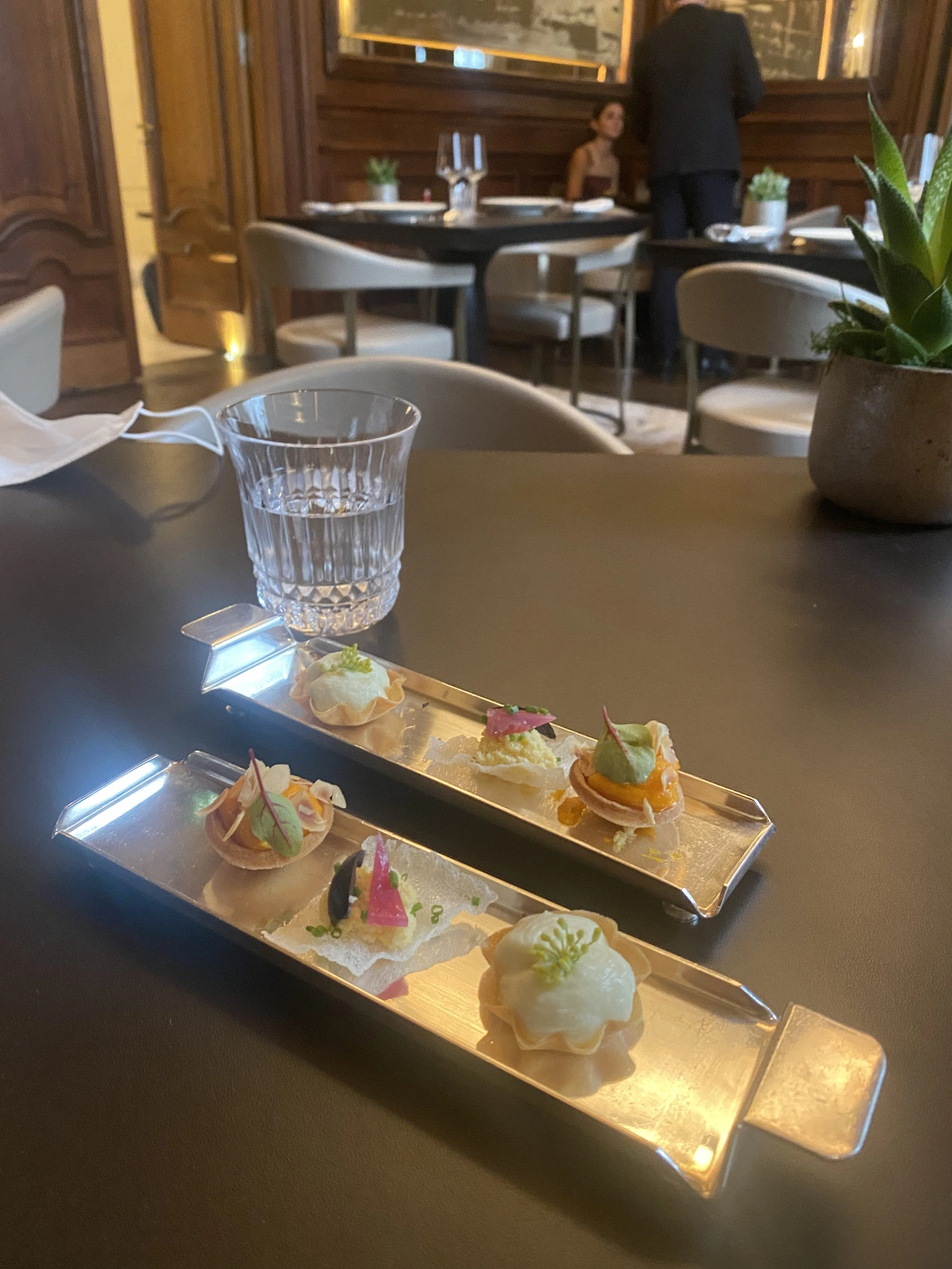 12시 10분에 루스벨트 역에 도착했고, 몽테뉴 거리에 있는 명품샵을 둘러봤다. 샤넬, 루이비통, 프라다, 디올 등 명품샵이 즐비했다. 몇 군데 들어가 보았다. 프라다, 알마니 매장에는 사람이 거의 없었다. 12시 30분에 식당 입구에 들어섰다. Maison Villeroy이라는 호텔 안에 있는 식당인데 2022년 미슐랭 원스타라는 표시가 호텔 입구에 있었다. 호텔 로비는 아담했다. 일박에 한화로 최소 150만 원에서 최대 1000만 원이었다. 들어보기만 했지 일박에 1000만 원인 곳이 있구나 싶었다. 그렇다고 포시즌 호텔, 리츠 호텔처럼 익히 들어본 이름도 아닌 곳인데 숙박 가격이 상당했다. 입구에 바로 식당이 있었다. 식당은 크지 않았다. 테이블은 단 6개. 테이블 6개를 놔두니 방이 가득 찼다. 대게 미슐랭 레스토랑은 테이블 간 간격이 꽤 떨어져 있는데 이곳은 그렇지는 않았다. 다소 어두운 편이었지만 분위기가 고즈넉하니 좋았다. 바로 옆에는 바가 있었다.