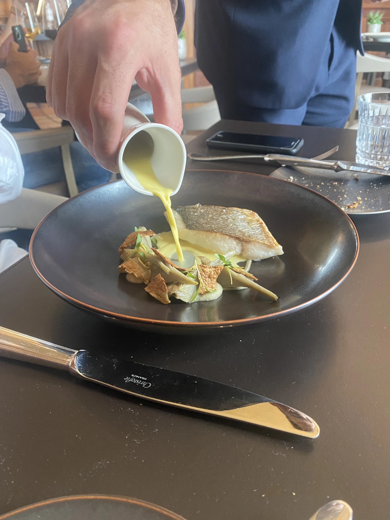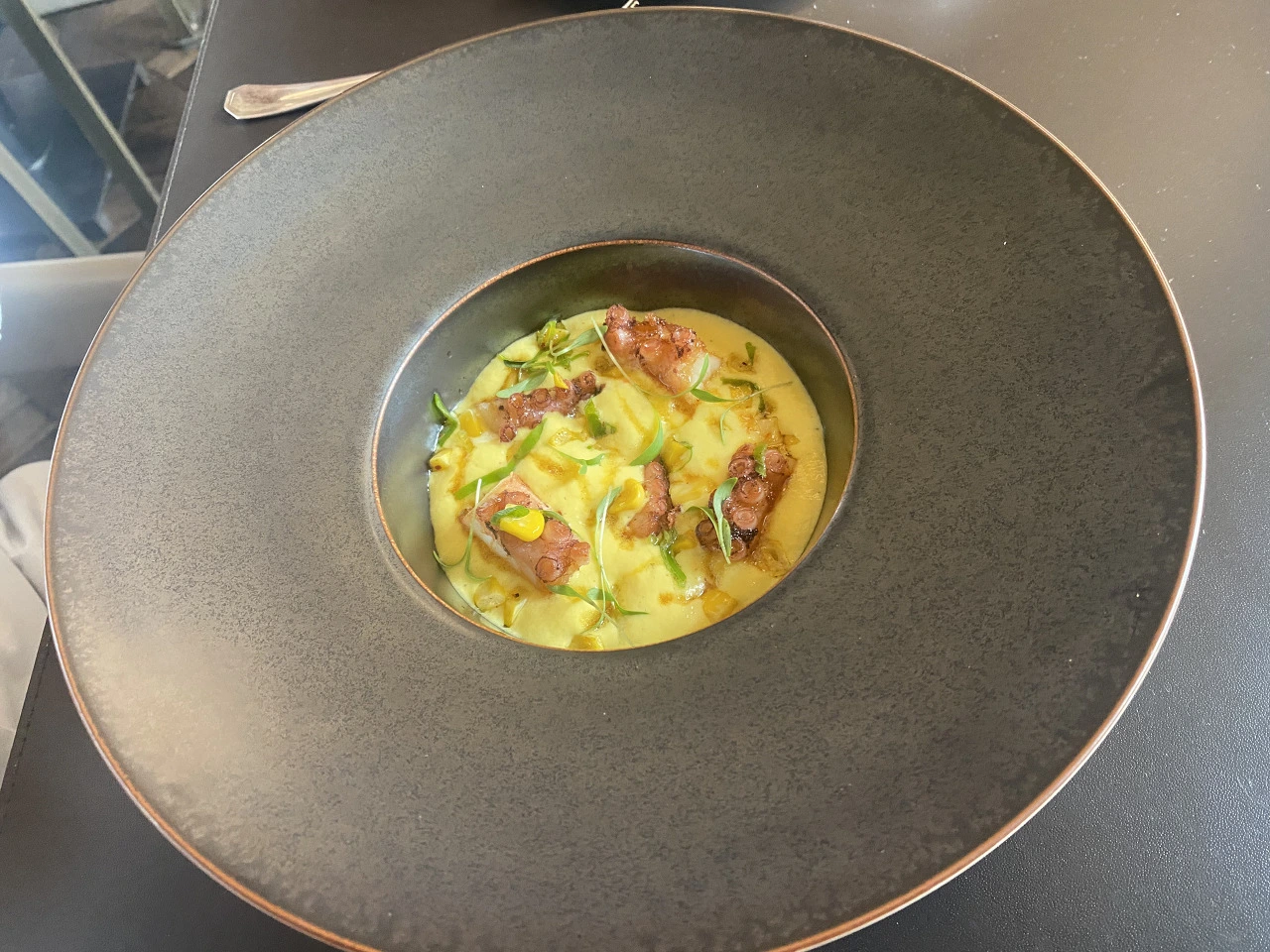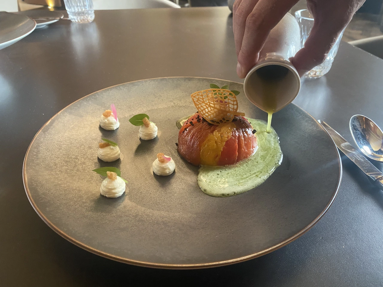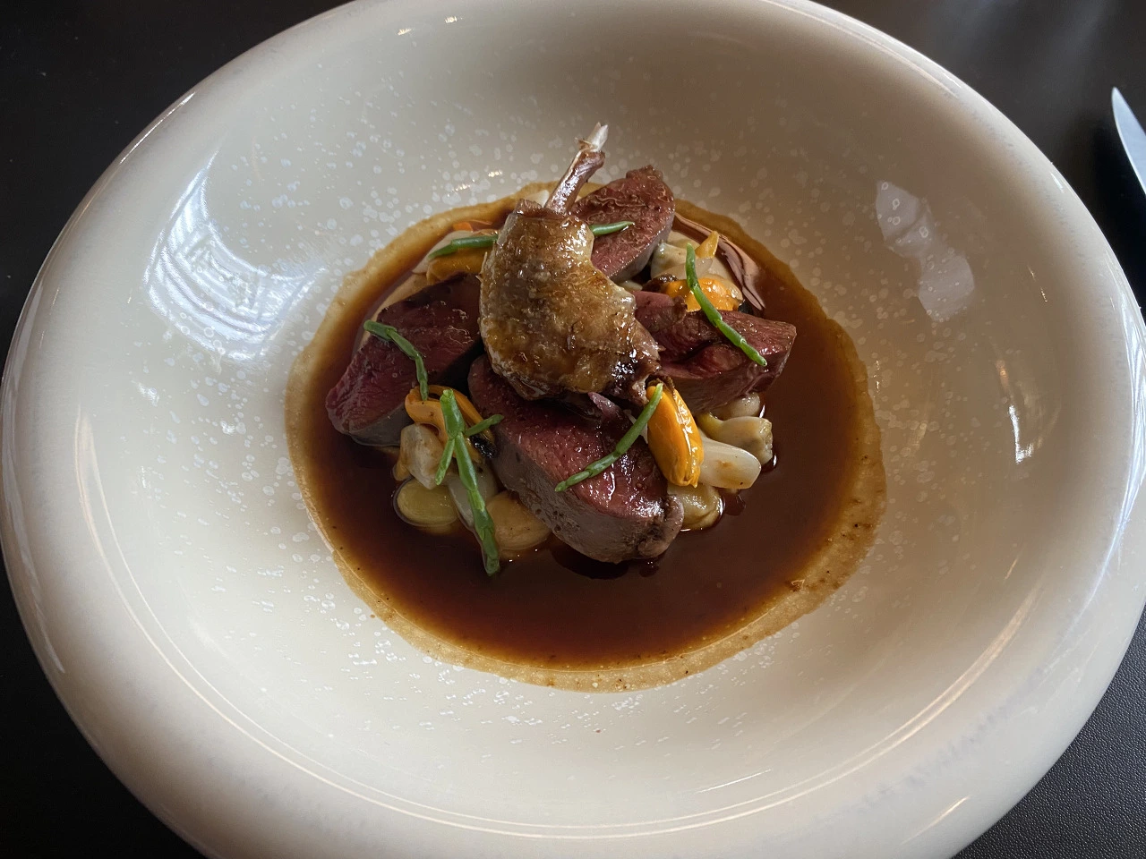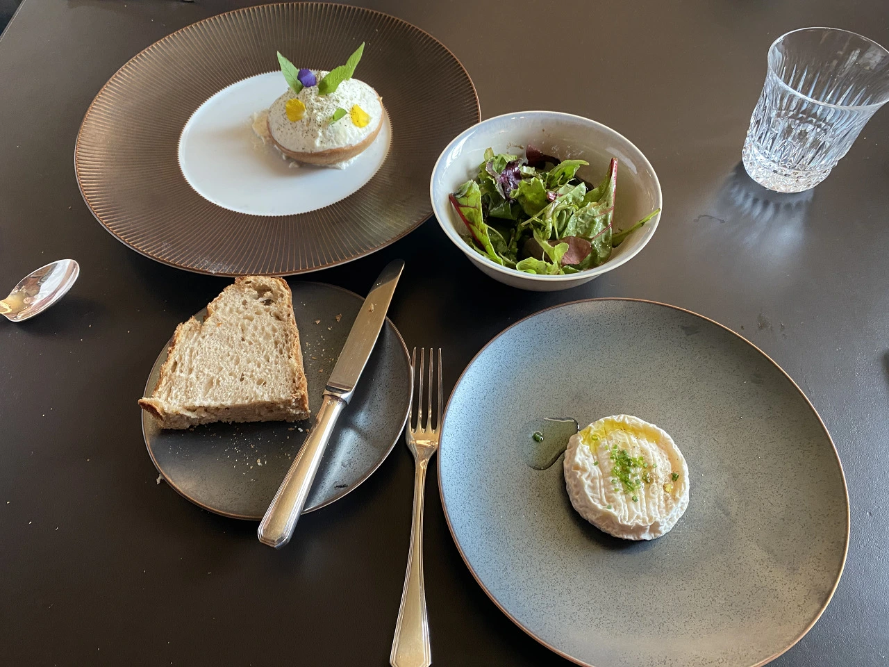 드디어 주문한 전식이 나왔다. 내가 선택한 Heirloom은 토마토의 한 종류인데, 마트에 가면 쉽게 볼 수 있는 토마토이다. 그런데 일반 토마토와는 조금 다르다. 크기가 조금 더 크고, 맛이 매우 달다. 한국으로 치면 찰토마토 같다고 날까. 나는 이 토마토를 좋아하는데, 이곳에서 전식으로 나온 요리는 푹 삶아서 껍질을 벗겨서 그 안에 부라타 치즈를 곳곳에 채워 넣었다. 신랑이 주문한 Rock Octopus는 삶은 문어와 그 밑에 옥수수 수프가 깔려있었다. 옥수수도 몇 개 들어있었다. 오랜만에 먹어보는 문어라 그런지 맛있었다. 식감이 쫄깃하니 좋았다. 전식으로는 신랑은 구운 대구 생선과 보라색 아티초크가 곁들여져 나왔다. 나는 Imperial pigeon 즉, 비둘기 요리를 주문했다. 비둘기 다리 꽁피와 코코넛과 홍합을 비롯한 해산물이 곁들여졌다. 마지막 디저트로는 남프랑스 염소 치즈와 살구와 크림이 섞여있는 적당히 단맛의 디저트가 나왔다.