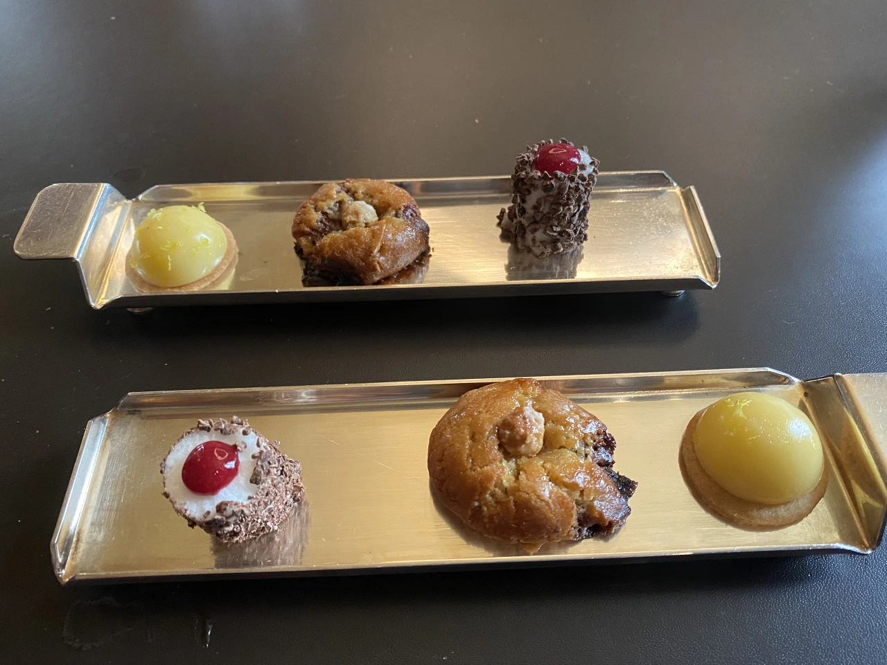 다른 테이블은 모두 와인을 주문했다. 화이트 와인 및 레드 와인을 적절하게 곁들여 먹고 있는데, 우리 가족은 따로 주문하지 않았다. 둘 다 술을 잘 못하기 때문이다. 대부분 이런 곳에 오면 와인을 곁들여 먹는데 우리는 처음에는 미슐랭 식당에 가면 괜히 눈치가 보여서 시키곤 했지만 이제는 마시고 싶지 않은데 억지로 마시지는 않는다. 일반 물을 달라고 했고, 스파클링 물도 가능하다고 해서 스파클링으로 달라고 했다. 물을 따로 시키면 돈을 받는데, 돈을 내지 않는 탭 워터를 달라고 하면 그냥 준다. 디저트까지 다 먹고 나니, 마지막으로 피니쉬라며 핑거 푸드가 나왔다. 계란 흰자와 초콜릿, 체리와 만든 것, 홈메이드 쿠키, 레몬 타르트가 나왔다. 프랑스 음식은 접시에 담긴 양이 얼마 안 될 것 같지만 천천히 하나씩 먹고 나면 이미 배가 많이 부르다는 것을 느끼고, 마지막에 가서는 배가 엄청 부른 것을 알게 된다. 한국 음식은 한 번에 반찬이 여러 개가 나와서 막 먹다 보면 배가 부른지도 모르고 먹는데, 프랑스 음식은 하나씩 천천히 나오니 금방 배가 부르다는 것을 느낀다.