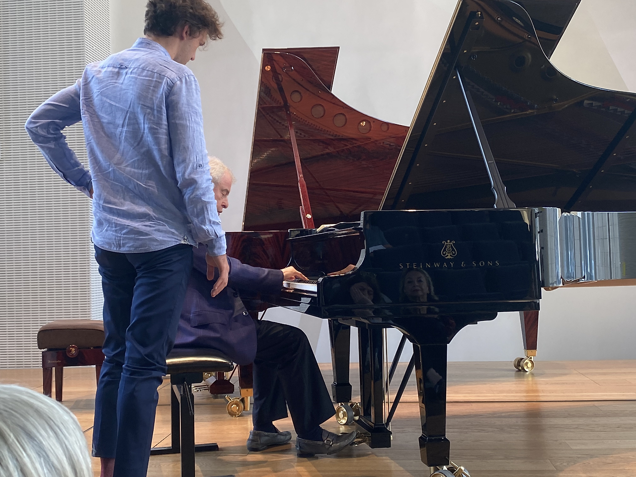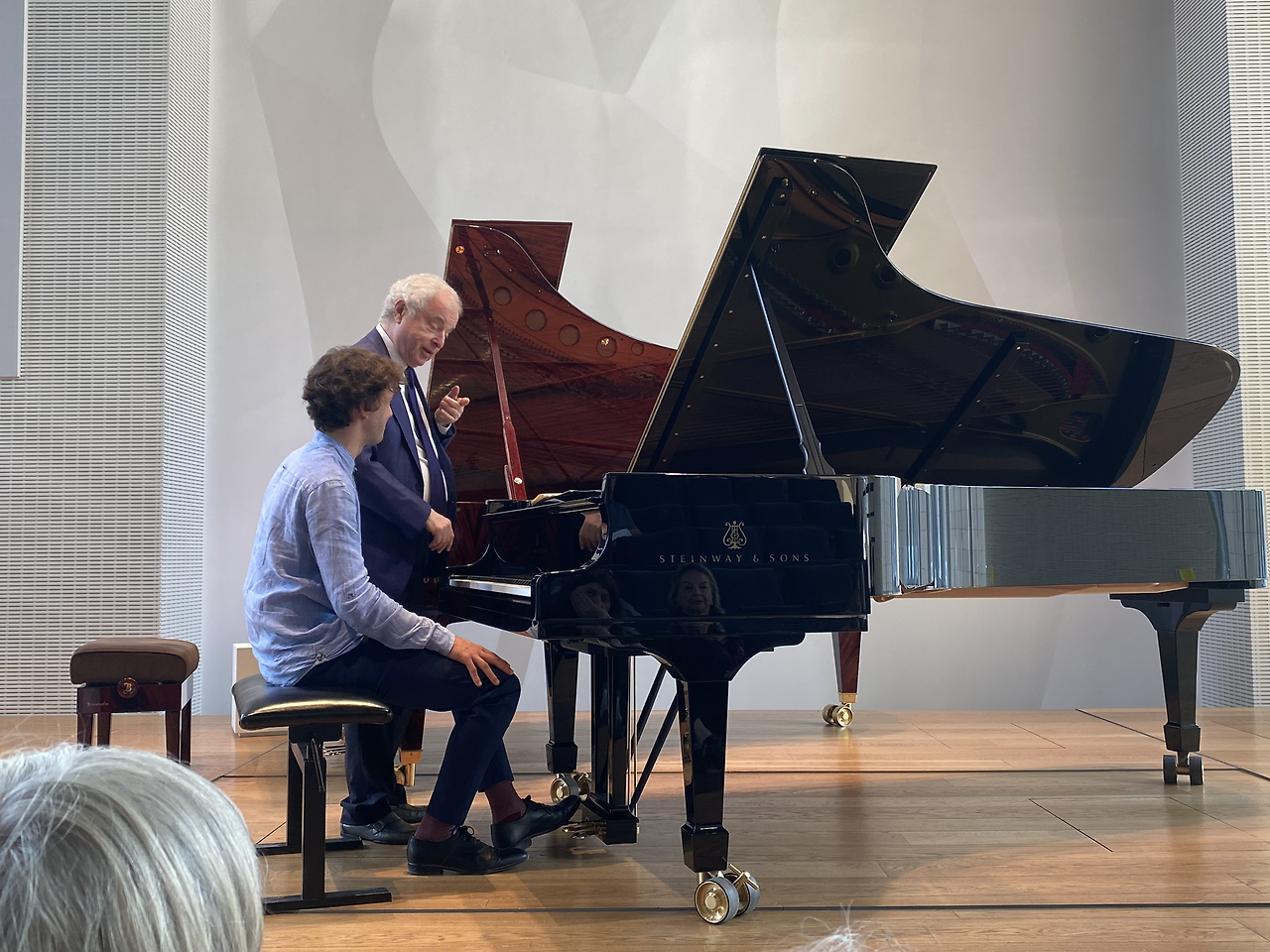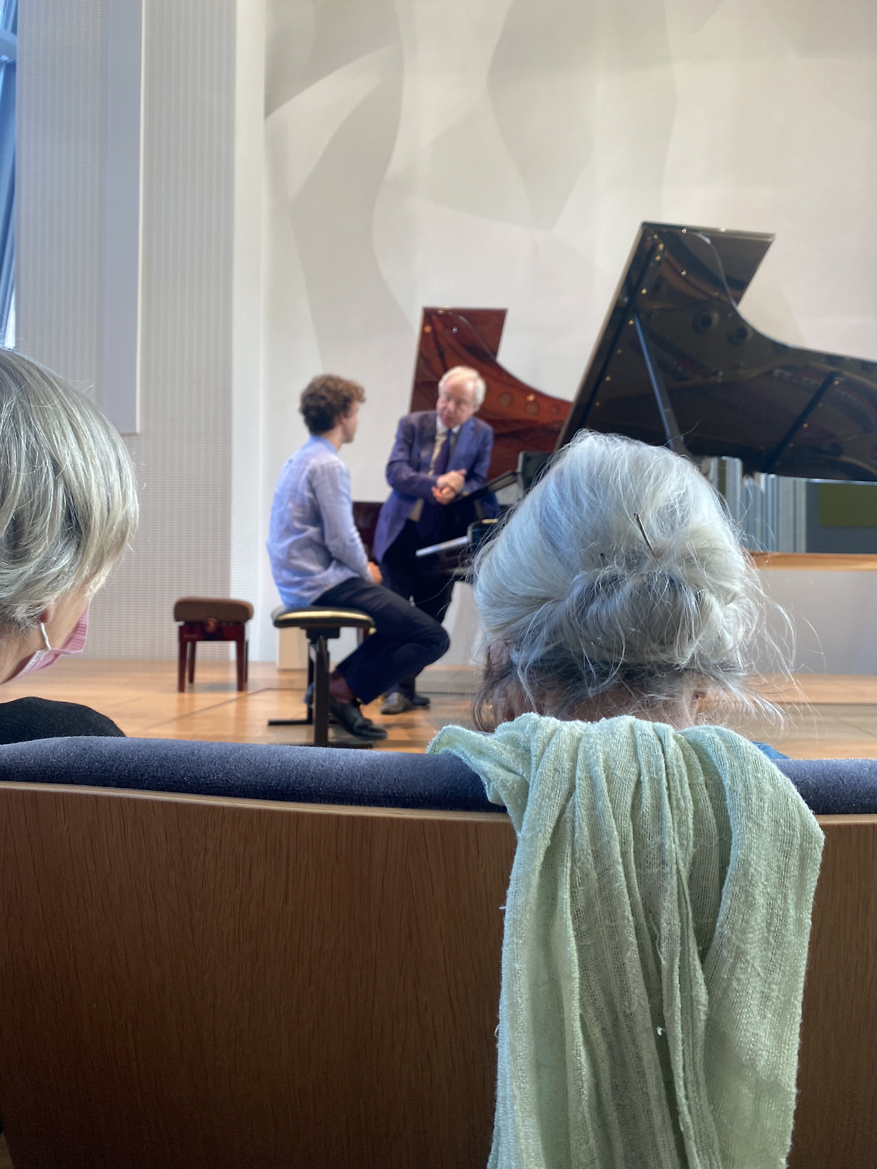 나는 맨 앞줄에 앉으려다가 너무 부담되나 싶어서 두 번째 줄에 앉았다. 마침 두 번째 줄 중간에 빈자리가 있었다. 명당 중 명당자리였다. 연주자의 손가락을 바로 볼 수 있었다. 안드라스 쉬프가 무대 위로 올라왔다. 편안해 보이는 구두, 검정 양복바지, 감색 양복 재킷, 감색 넥타이, 흰 와이셔츠를 입고 있었다. 백발의 할아버지는 꽤나 깐깐해 보였다. 3명의 프랑스 국적의 남학생이 공개 수업에 참여했다.