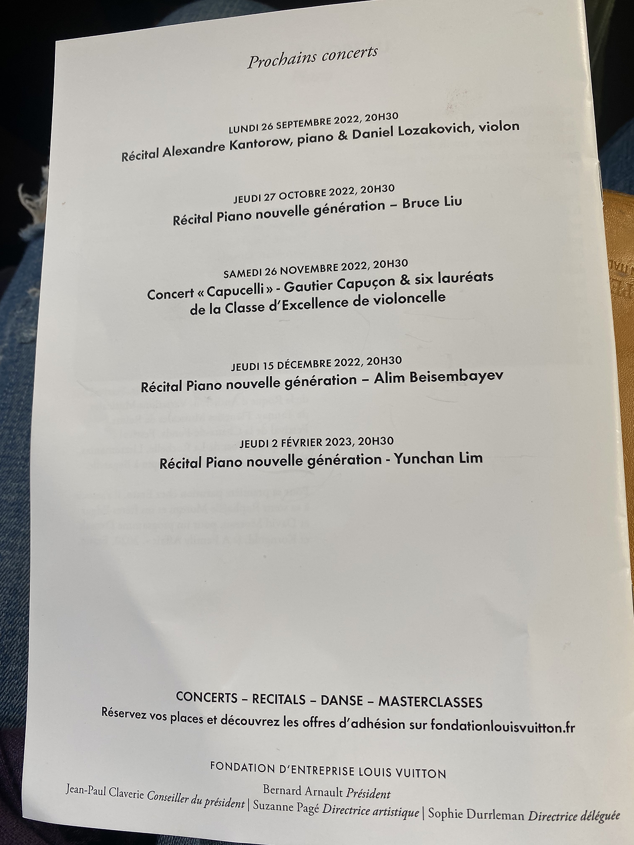 프로그램 뒤편을 보니, 루이뷔통 재단에서 주최하는 젊고 재능있는 차세대 유망주들을 소개하는 ‘뉴 제네레이션 피아노 리사이틀(Récital Piano nouvelle génération)' 시리즈에 임윤찬 씨가 내년 2월 이곳에서 연주하기로 예정되어 있다. 2017년, 같은 시리즈로 조성진씨가 이곳 무대에 오른적이 있다. 그때 나는 조성진 씨 연주를 들으러 이곳에 왔었다. 작년 제 18회 쇼팽 콩쿨 1위를 한 Bruce Liu도 같은 시리즈로 다음달 이곳에서 연주한다. 전 세계가 한국 연주가들에게 러브콜을 보내고 있다.